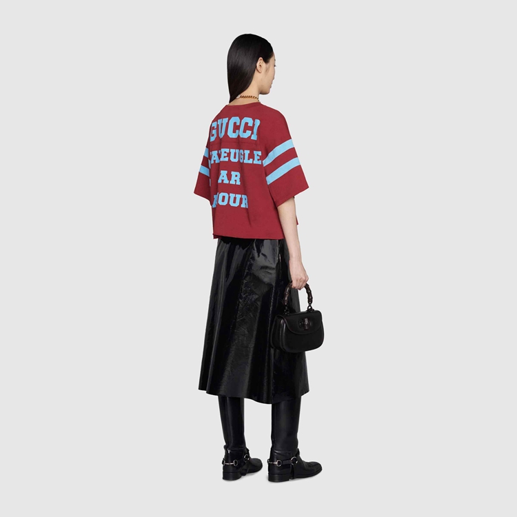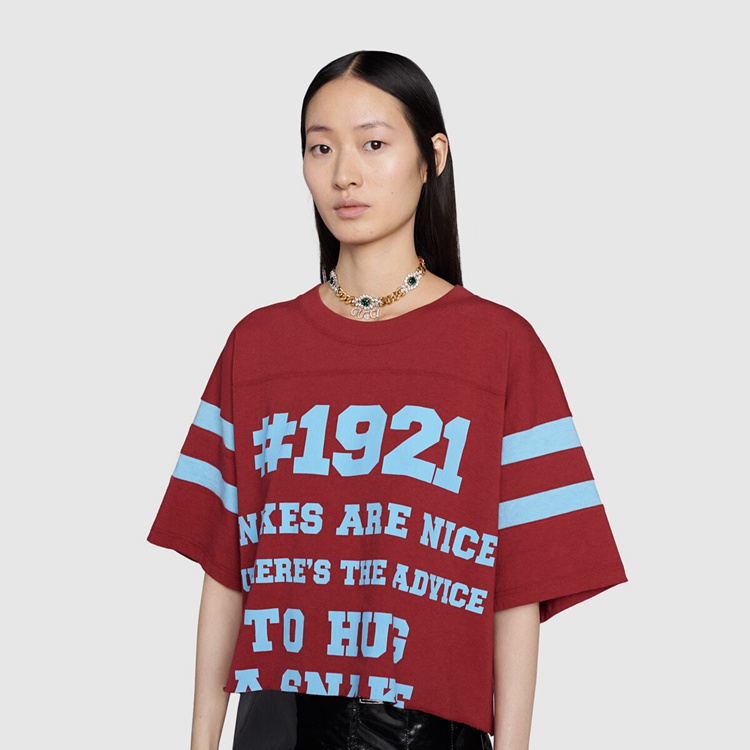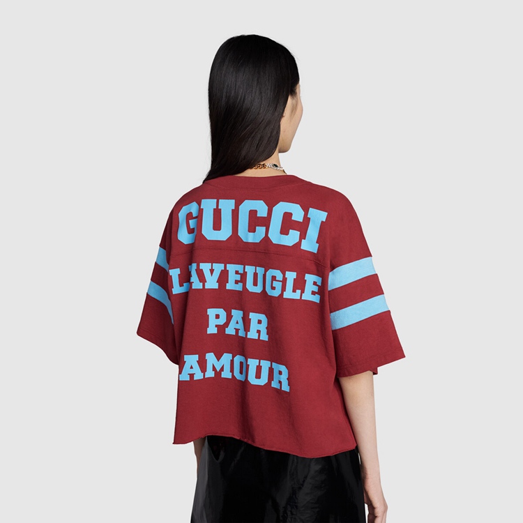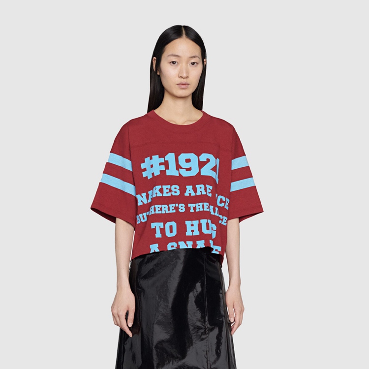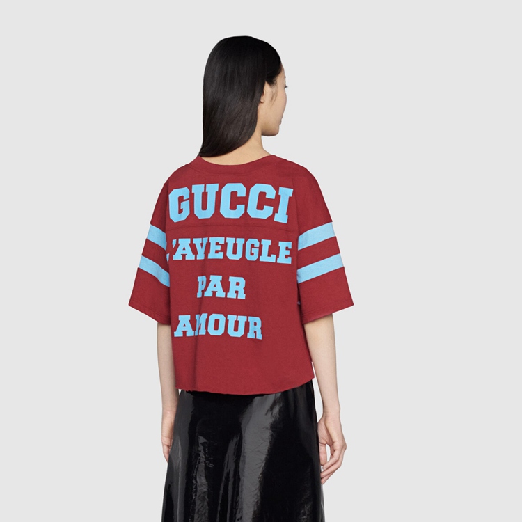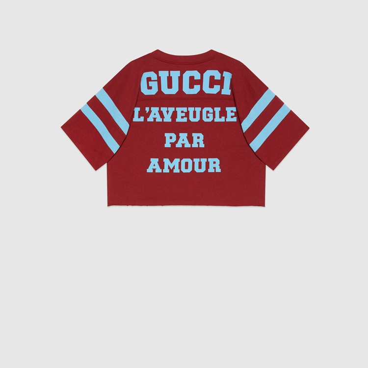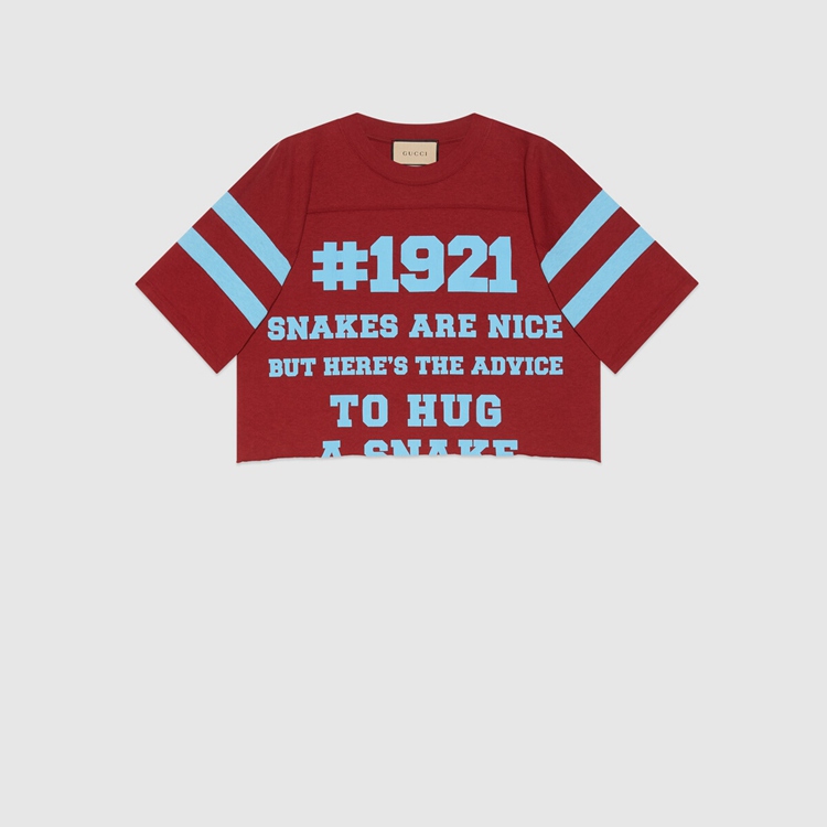 Style 660868 XJDKG 6234 Prints Inspired by endearing British nursery rhymes come together With various elements of The House For New interpretations of staple pieces. On The front of This dark red cropped t-shirt, The year of Gucci’s founding accompanies The quote “Snakes Are Nice But Here’s The Advice to Hug a Snake”. On The back, ‘L’Aveugle Par Amour’ plays on The House’s romantic inspirations.