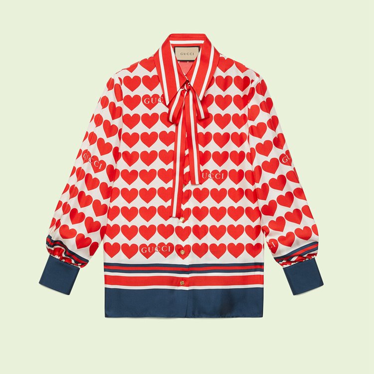 Style 686549 ZAIV6 6253 Reflecting The House’s romantic narrative, a self-tie bow decorates The front of This silk shirt, together With an allover heart print. For Gucci Love Parade, Classic styles are refashioned in contemporary silhouettes and mixed With eclectic references.