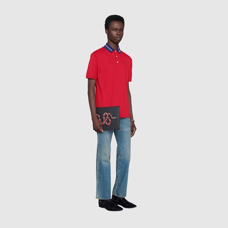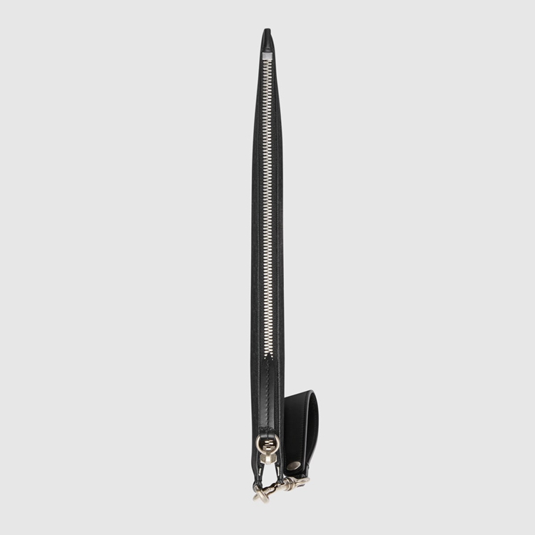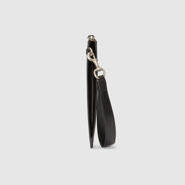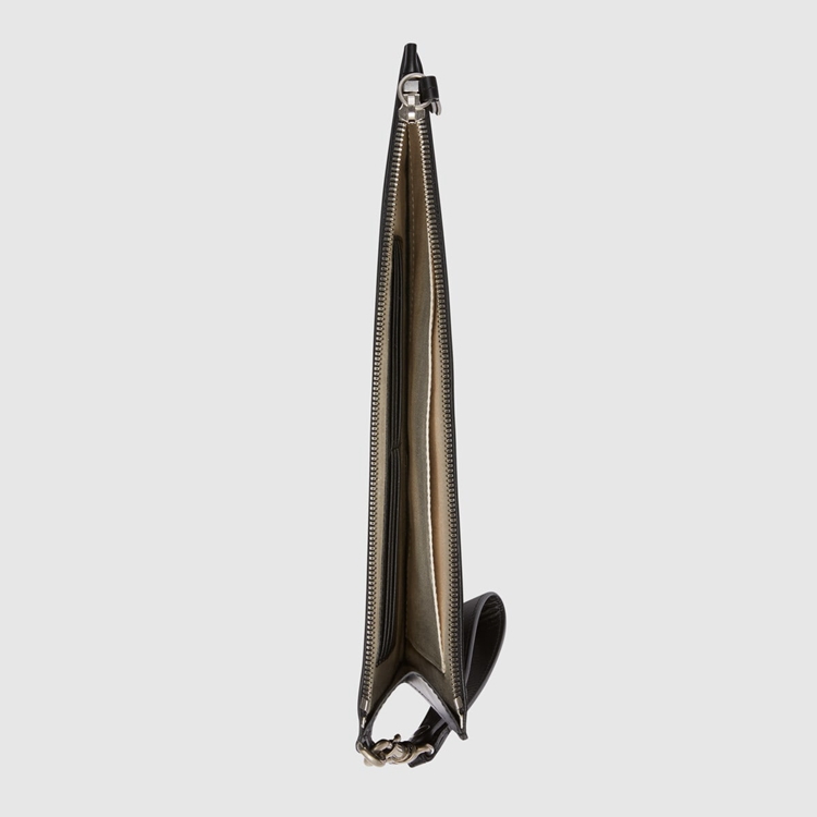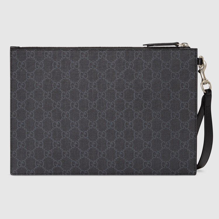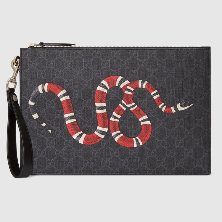 Style 473904 GZN1N 1058 A pouch Crafted from black and grey GG Supreme canvas. Completed by a tonal leather trim, The accessory features The Kingsnake—a symbol thought to represent wisdom and power.