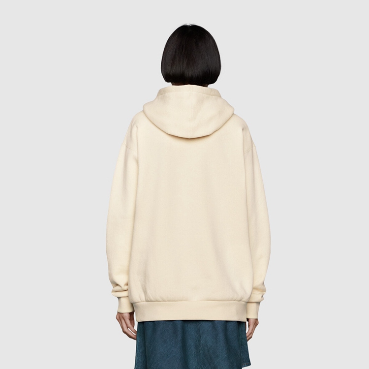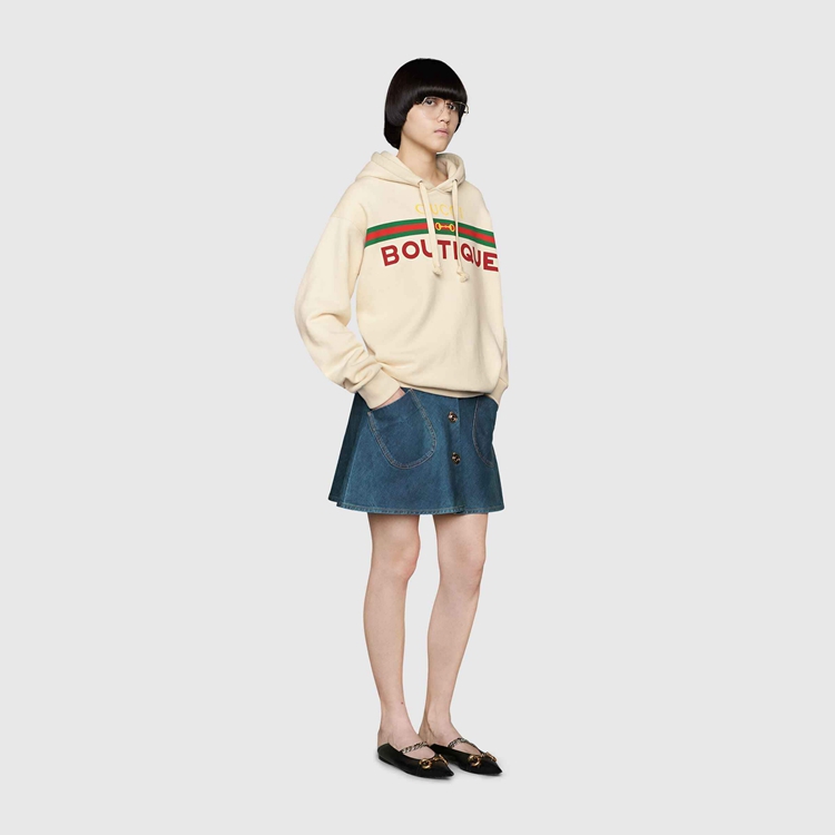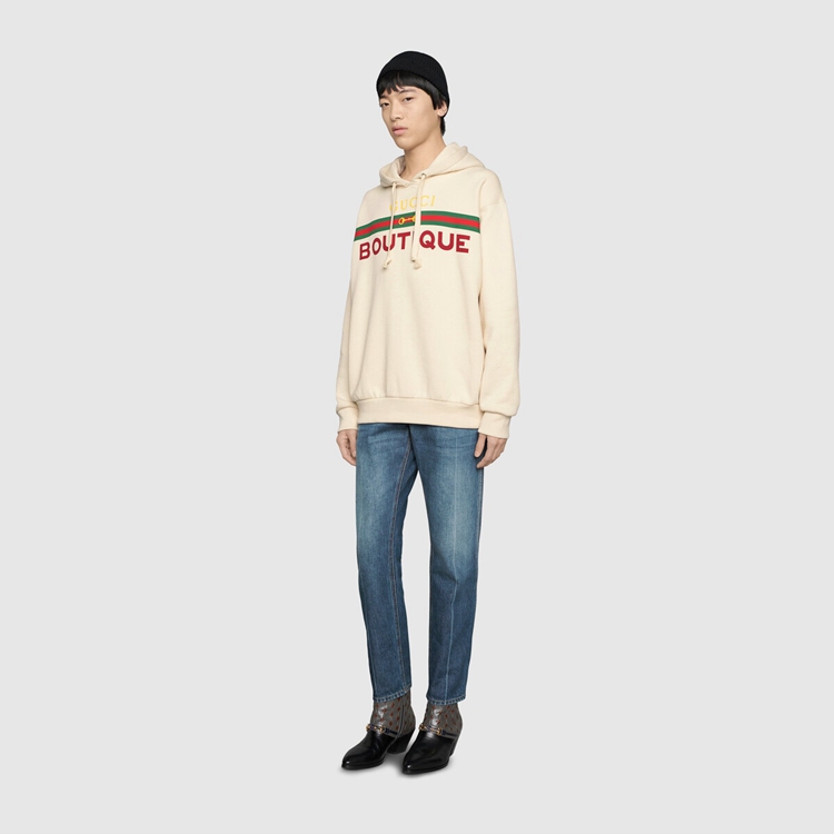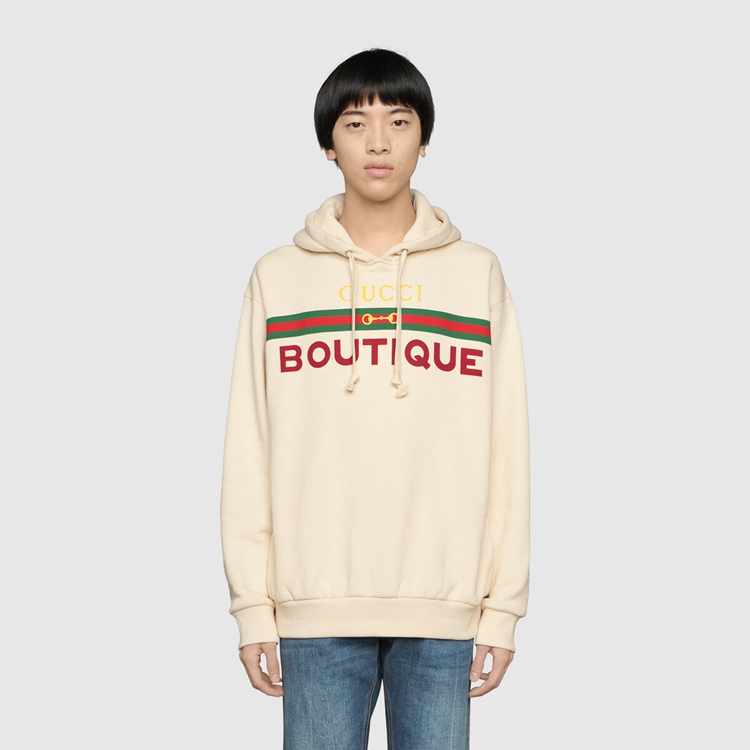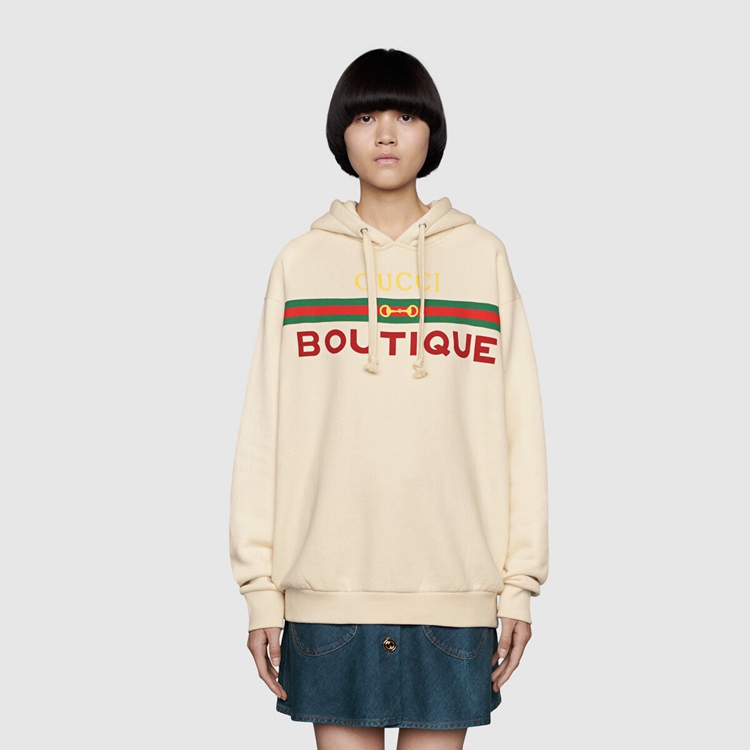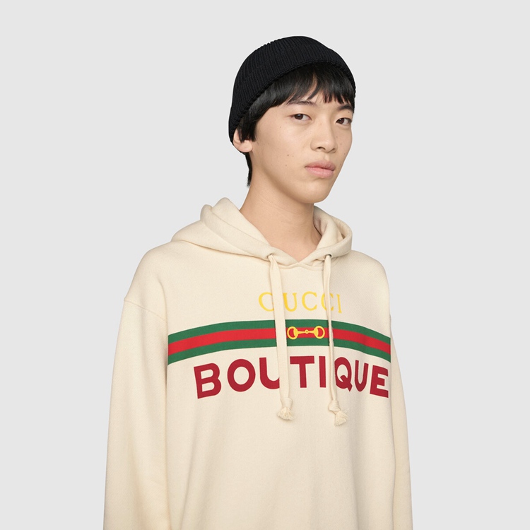 Style 615061 XJCKX 9230 A combination of historical elements that speak to Gucci’s heritage, like The Horsebit and The Web, The Boutique print has an intrinsic vintage feel. Introduced in The Spring Summer 2020 collection, The motif is presented on a hooded sweatshirt, Crafted from off-white heavy felted cotton jersey.