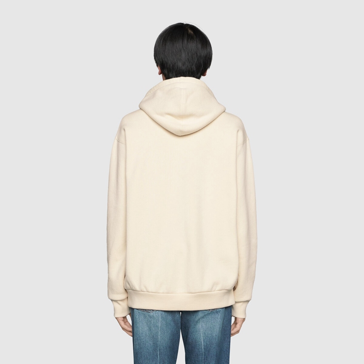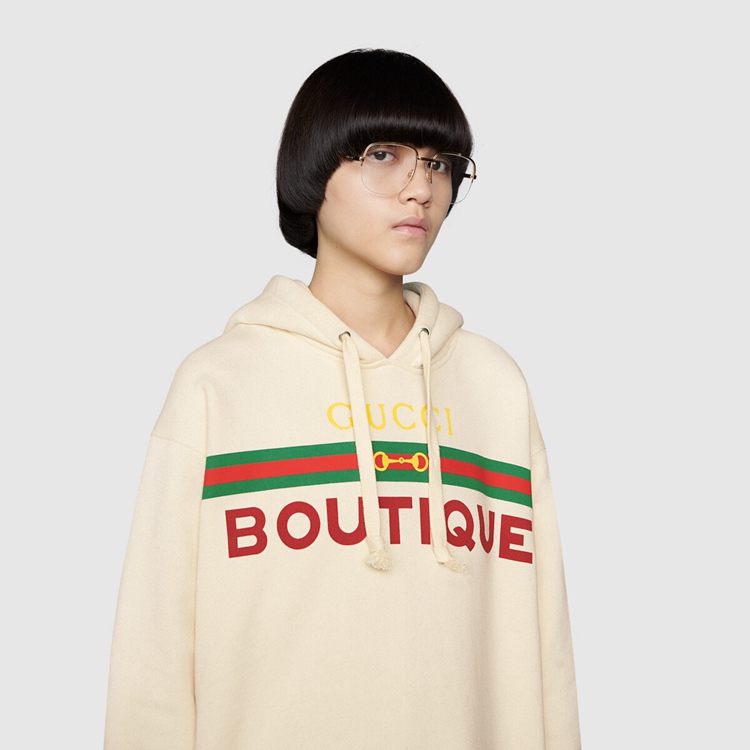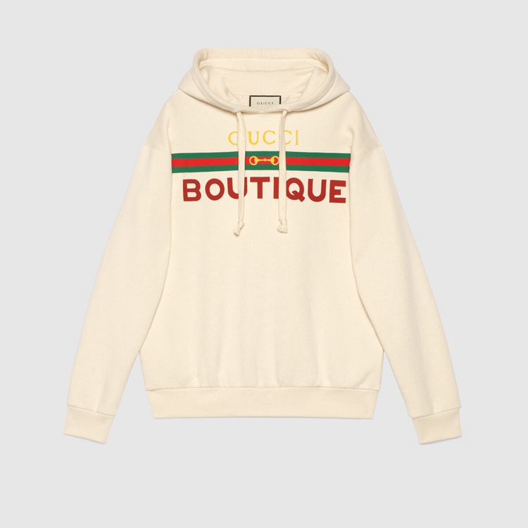 Style 615061 XJCKX 9230 A combination of historical elements that speak to Gucci’s heritage, like The Horsebit and The Web, The Boutique print has an intrinsic vintage feel. Introduced in The Spring Summer 2020 collection, The motif is presented on a hooded sweatshirt, Crafted from off-white heavy felted cotton jersey.