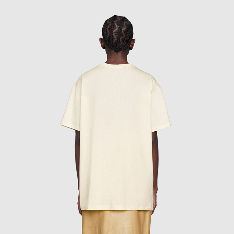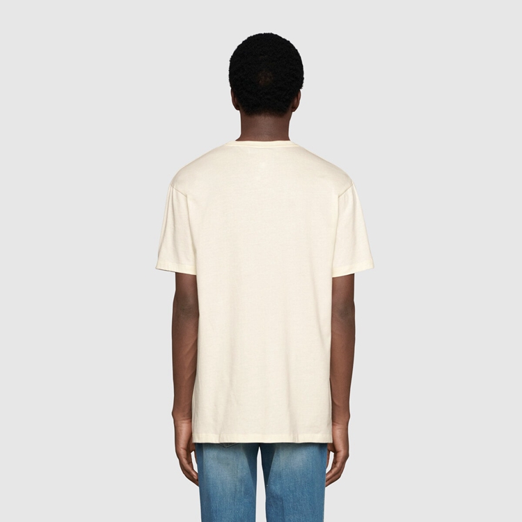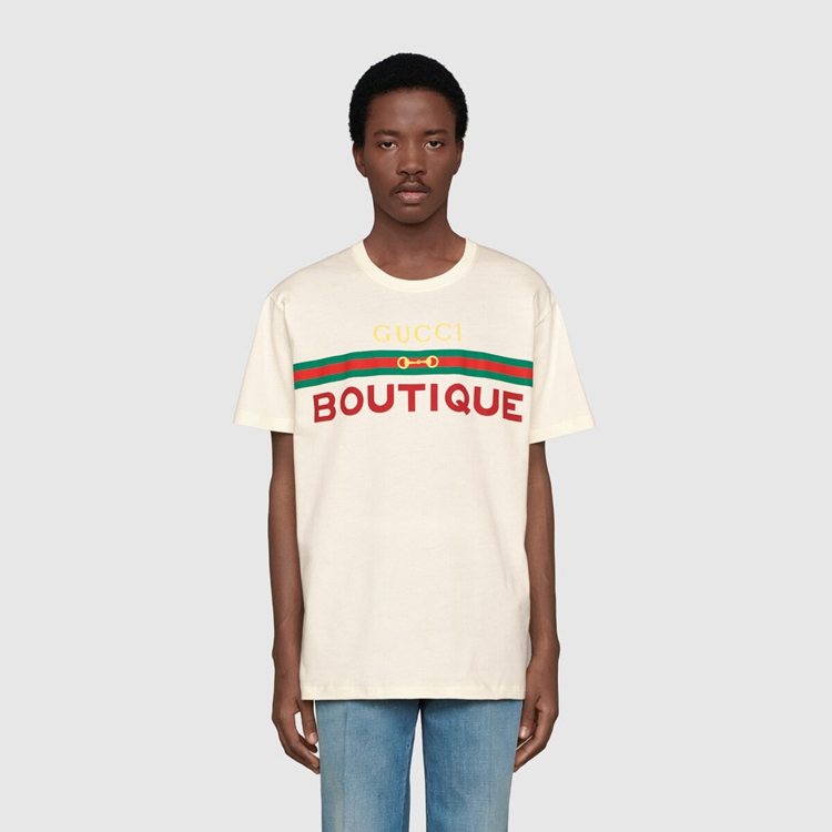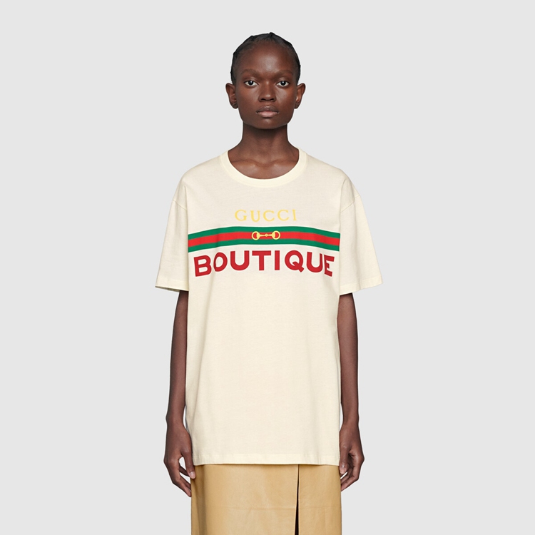 Style 615044 XJCKY 7136 A combination of historical elements that speak to Gucci’s heritage, like The Horsebit and The Web, The Boutique print has an intrinsic vintage feel. Introduced in The Spring Summer 2020 collection, The motif is presented on an off-white cotton jersey T-shirt.
