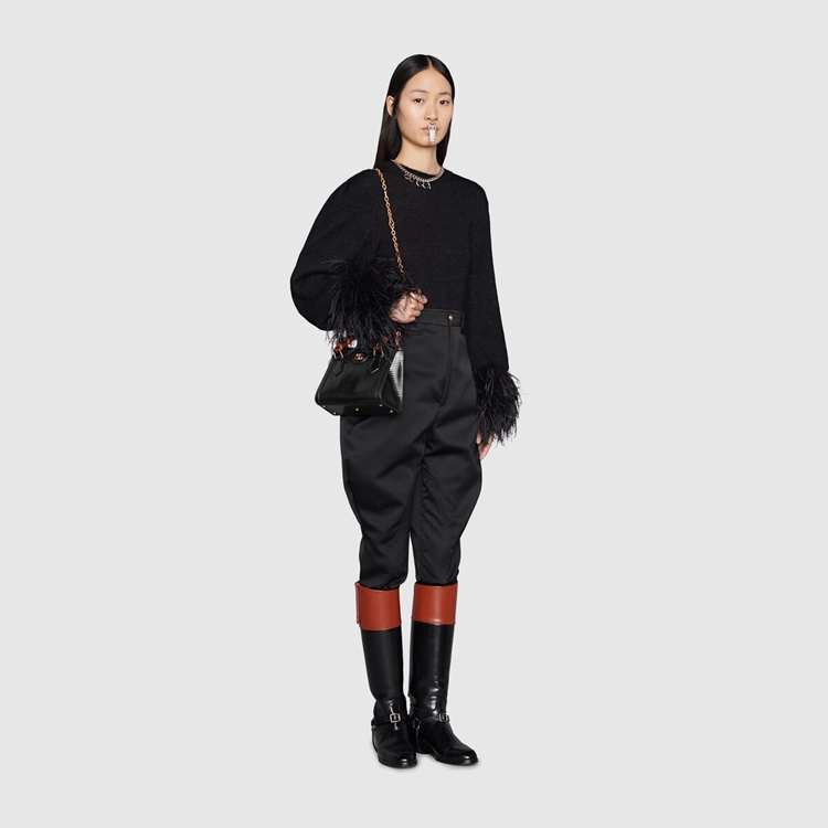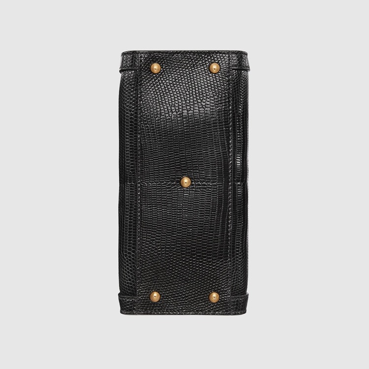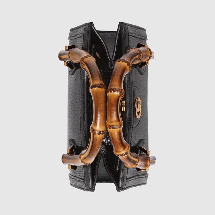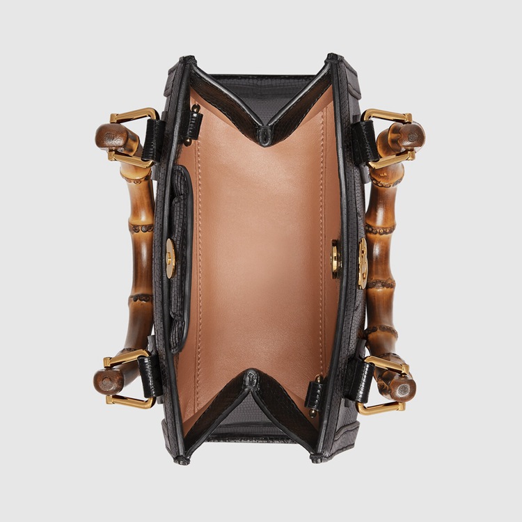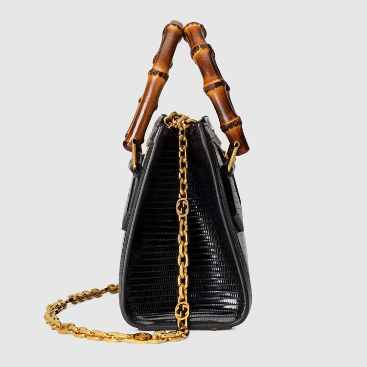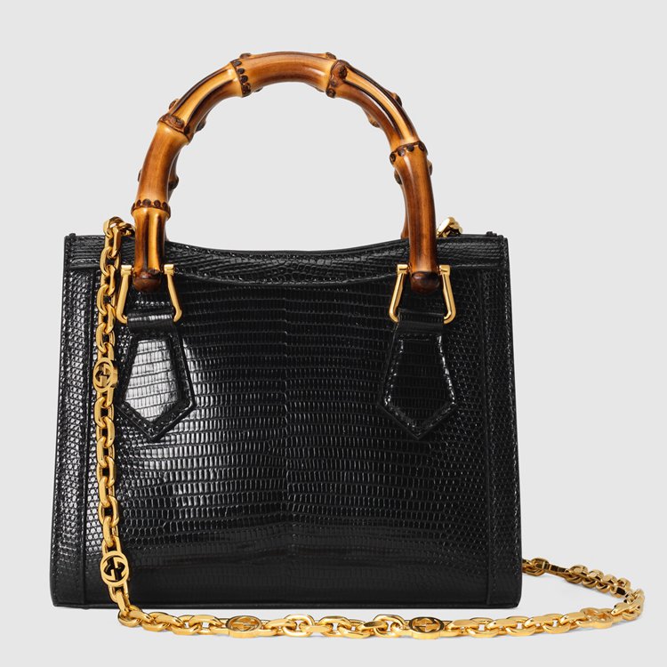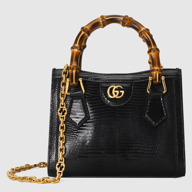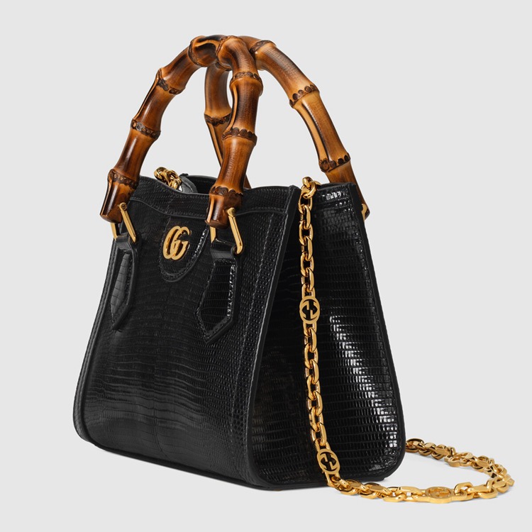 Style 675800 LUZ0G 1000 A precious take on The Emblematic design, The Gucci Diana is introduced in black lizard. Inspired by symbols from different eras of Gucci’s history, The mini bag is completed by The line’s recognizable bamboo handles and Double G hardware.