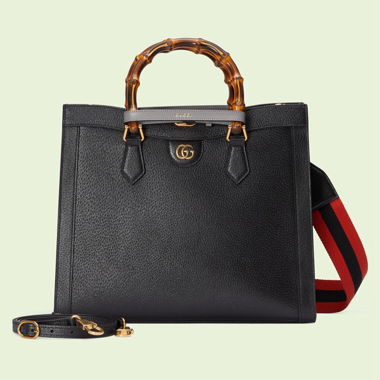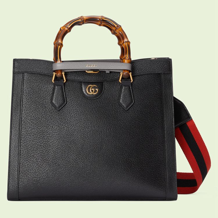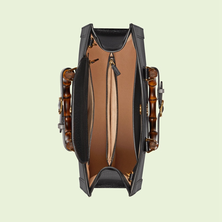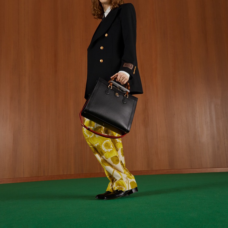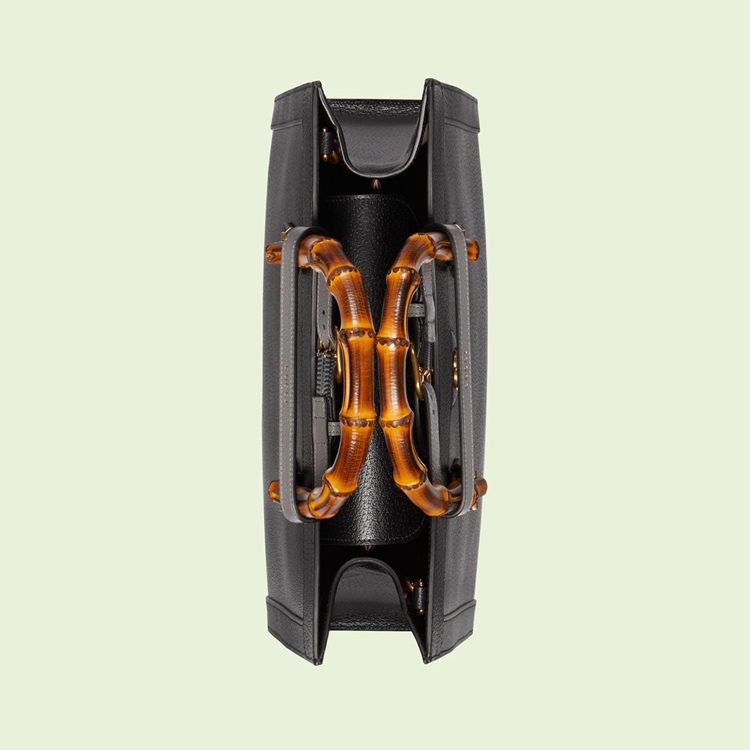 Style 678842 U3ZDT 1260First used in The post-war era when traditional materials were hard to come by, bamboo has become not only a symbol of The spirit of reinvention that runs throughout The House’s Designs but One of Gucci’s most recognizable signatures. The Gucci Diana embodies This idea, representing The notion of style in constant evolution With its removable leather belts—a nod to The functional bands used to keep The handles in shape. Here, The bag is presented in black leather.