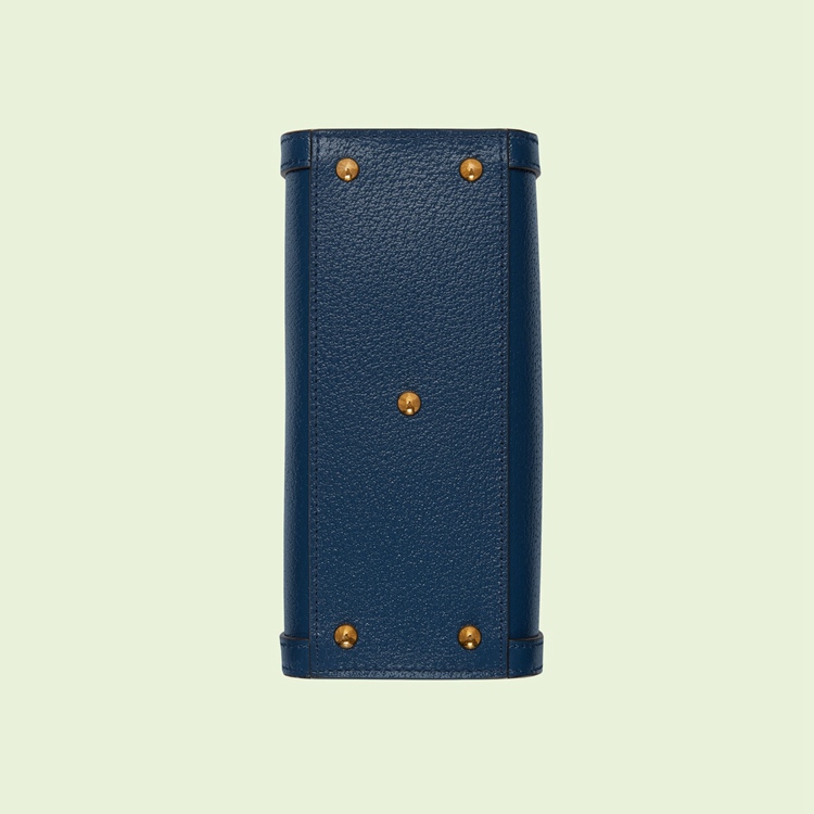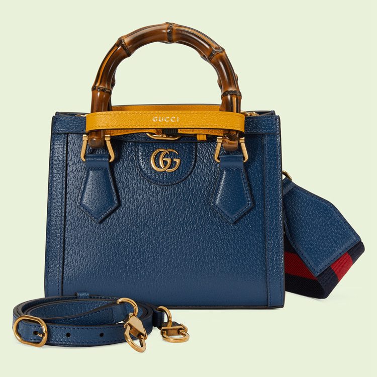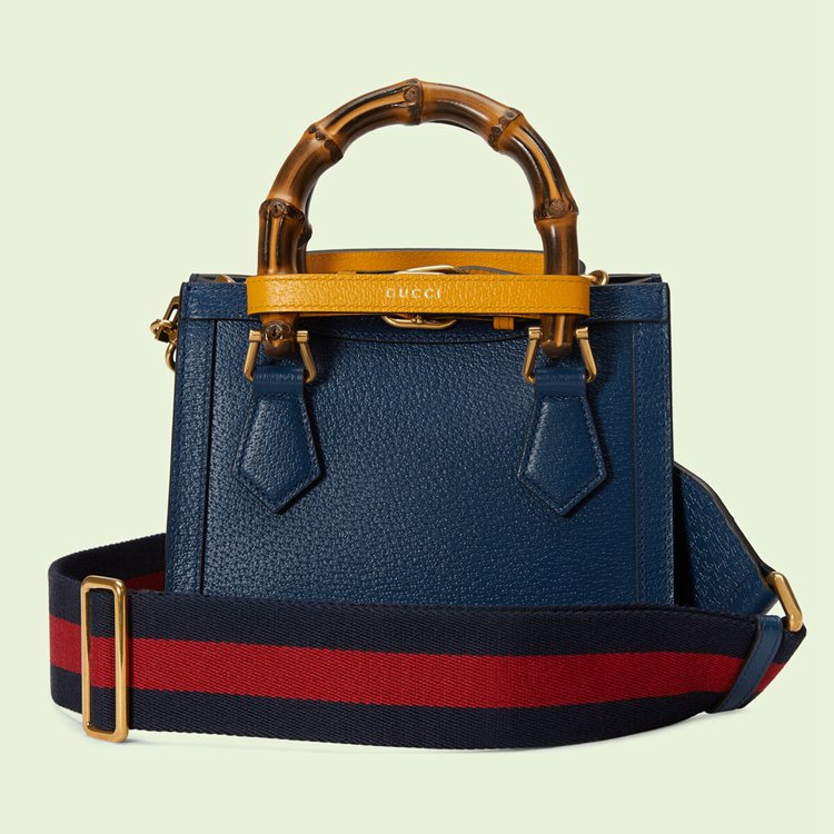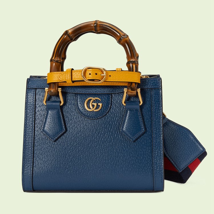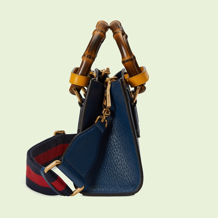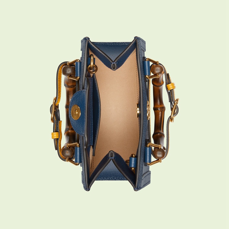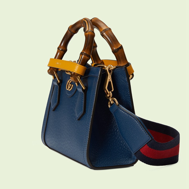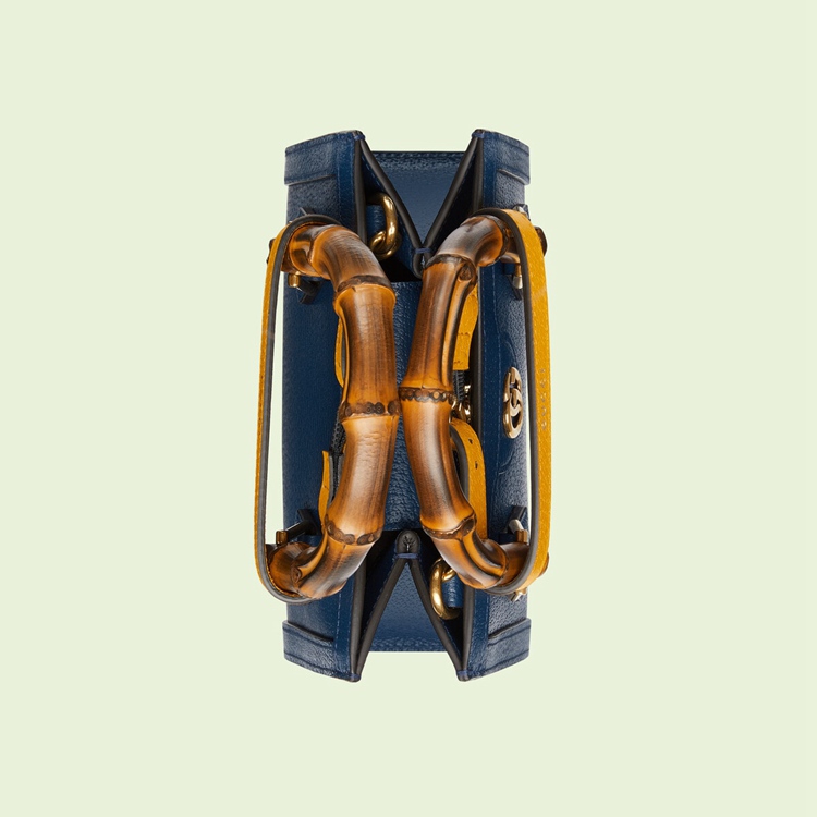 Style 702732 U3ZDT 4862Combining recognizable elements of The House, The Gucci Diana is defined by its bamboo handles and Double G hardware. Crafted from royal blue leather, The mini tote bag is further accentuated by two neon bands, a playful reference to The bands used to keep handles in shape.