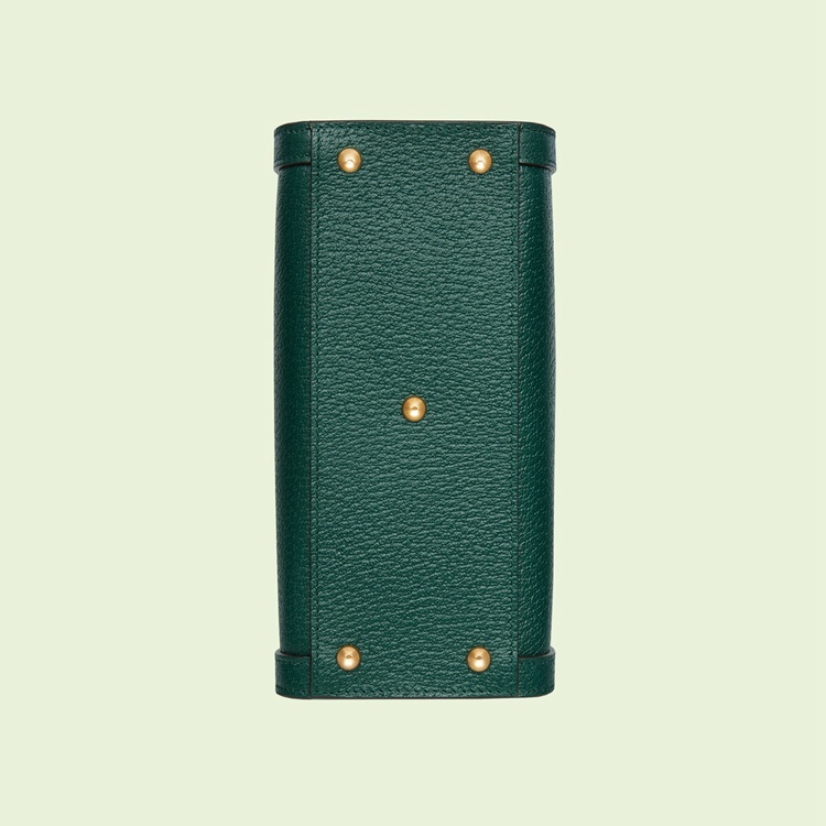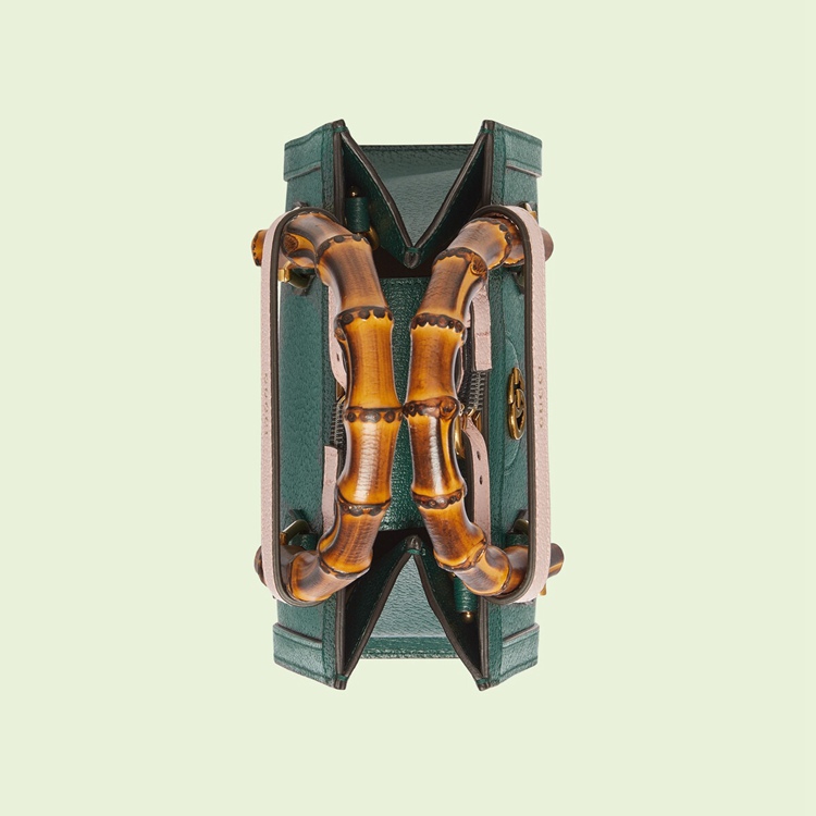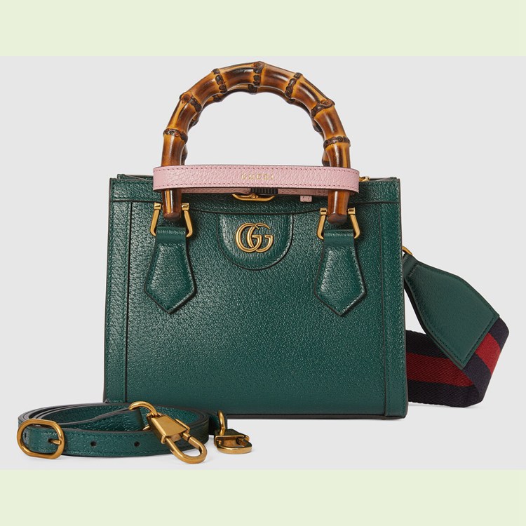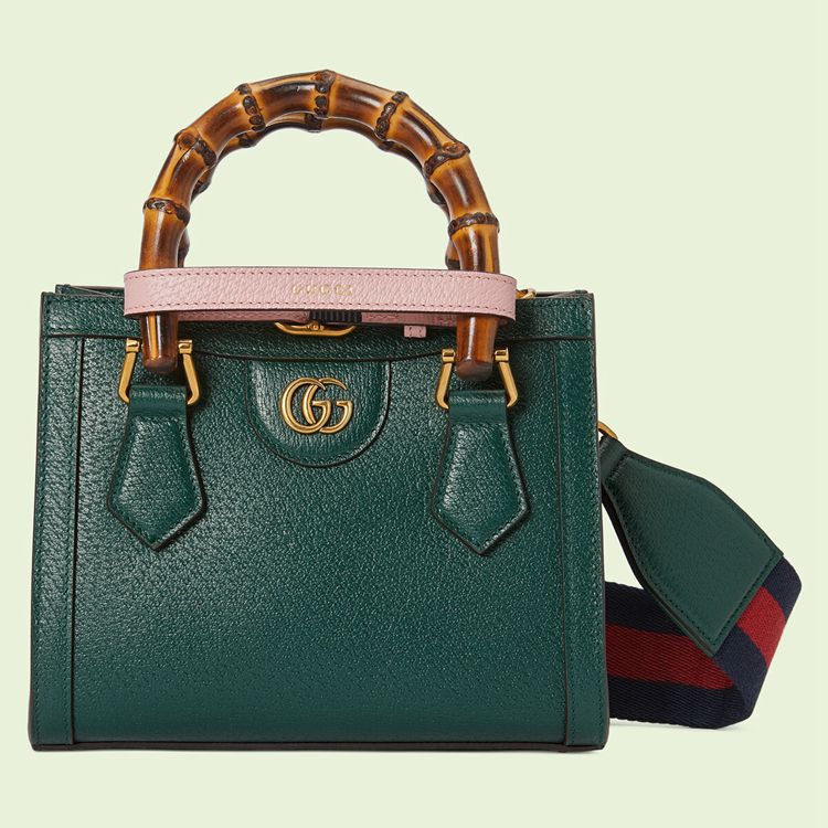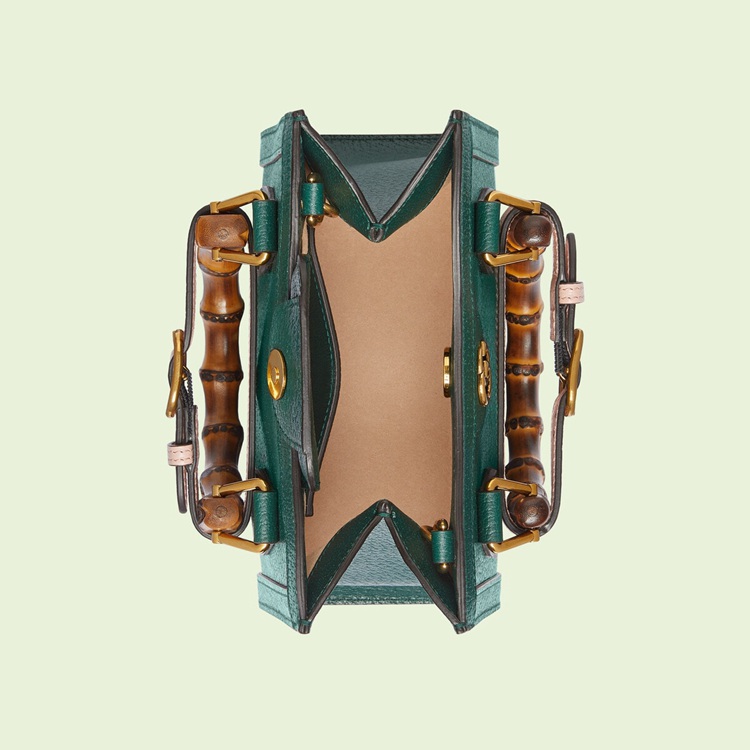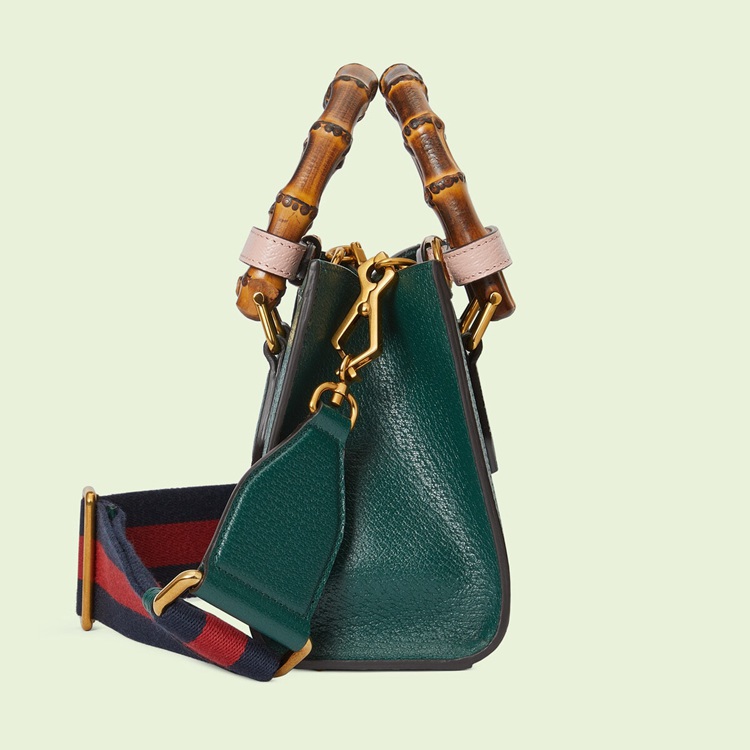 Style 702732 U3ZDT 3670An evolution of a bamboo handle tote first introduced in 1991, The Gucci Diana represents The notion of style in constant evolution and is reimagined With removable, neon leather belts—a nod to The functional bands used to keep The handles in shape. Here, a mini version of The Emblematic style is presented in green leather.