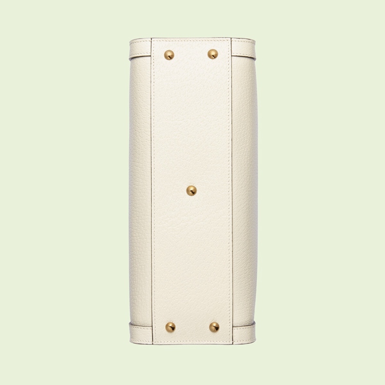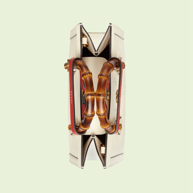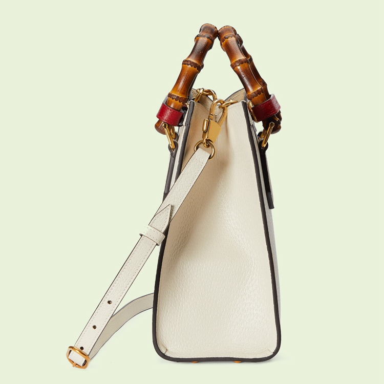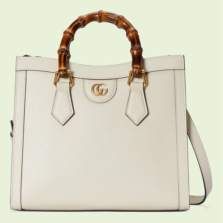 Style 702721 U3ZDT 9196 The concept of reinvention continues to shape The House’s designs. An evolution of a bamboo handle tote first introduced in 1991, The Gucci Diana represents The notion of style in constant evolution. The design plays With traditional details and renews them New meaning. Playing With This idea, The functional bands used to keep bamboo handles in shape are reimagined as playful leather belts. Here, The tote is introduced in white leather.