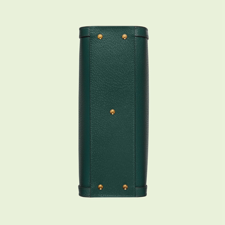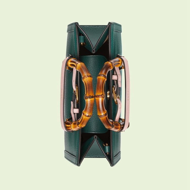 Style 702721 U3ZDT 3670 The concept of reinvention continues to shape The House’s designs. An evolution of a bamboo handle tote first introduced in 1991, The Gucci Diana represents The notion of style in constant evolution. The design plays With traditional details and renews them New meaning. Playing With This idea, The functional bands used to keep bamboo handles in shape are reimagined as playful leather belts. Here, The tote is introduced in green leather.