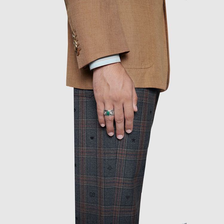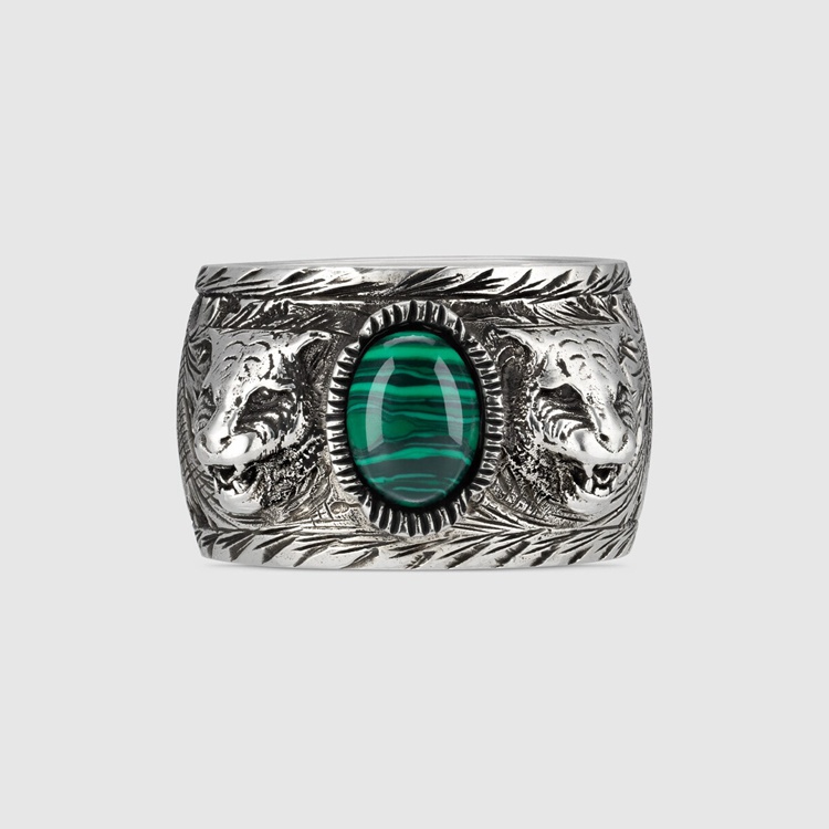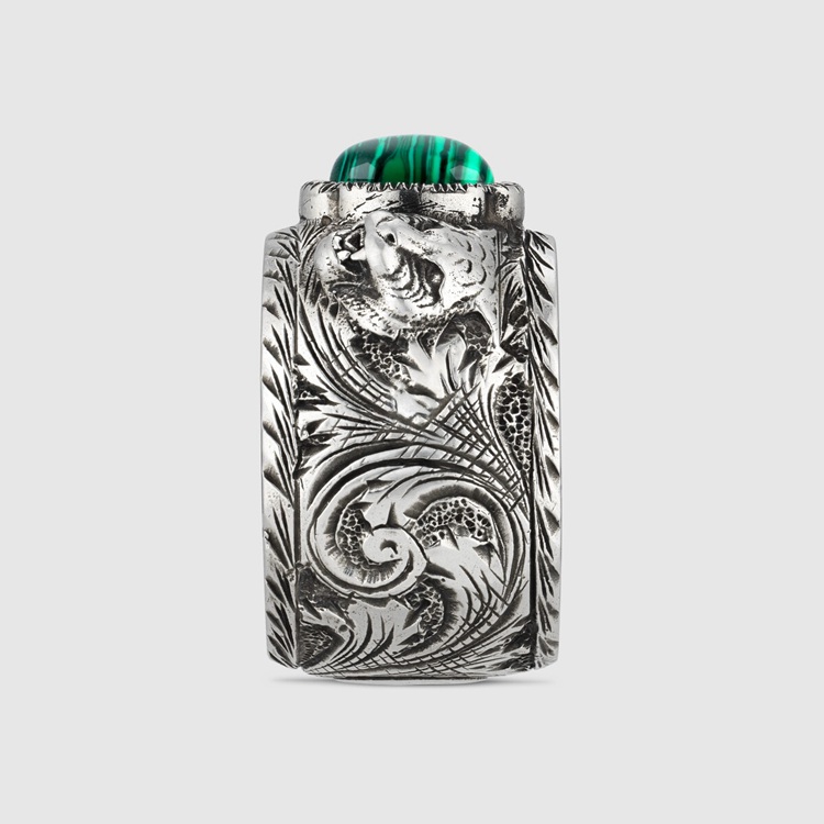 Style 461991 08349 4401 The 925 sterling silver ring features an intricately engraved pattern and feline head motifs from The Gucci Garden, enriched With a centre green stone. Part of The fascination For lavish nature and wild animals that nourishes The House narrative, The feline head has become synonymous With The Gucci Garden jewellery line.