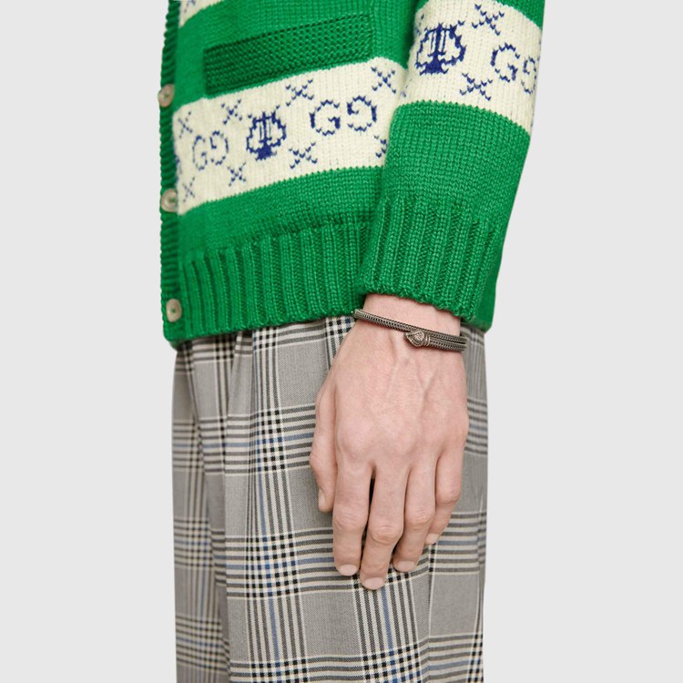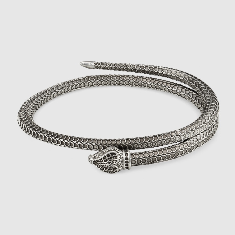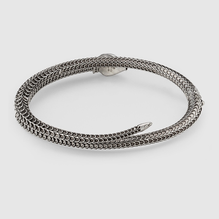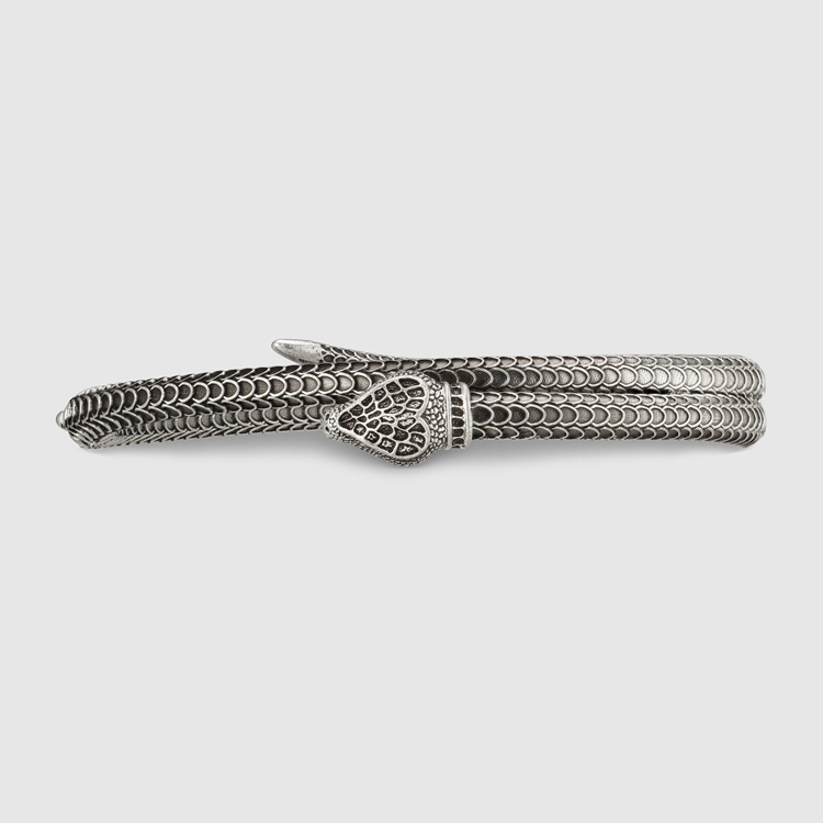 Style 577283 J8400 0811 Crafted from 925 sterling silver With an aged finish, This snake-shaped bracelet features engravings recreating The reptile’s scales. Part of The fascination For lavish nature and wild animals that nourishes The House narrative, The snake has become synonymous With The Gucci Garden jewelry line.