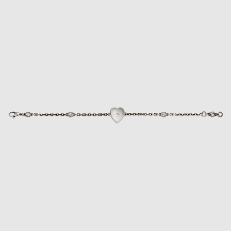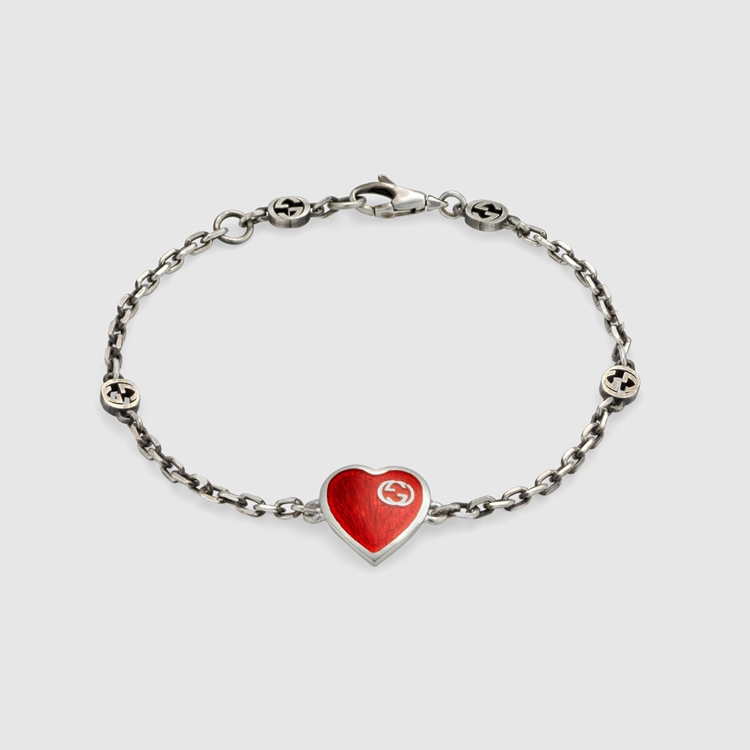 Style 645546 J89B4 1192From its intricately engraved stencil heart pendant to its woven link chain, The Emblematic Interlocking G symbol defines This sterling silver bracelet. Giving The Classic motif a bright and playful twist, is red enamel.