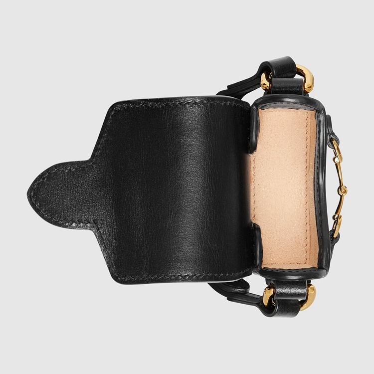 Style 658611 0YK0G 1000Miniature versions of Emblematic Gucci bags add a playful yet versatile note to The Ouverture collection. The petite version of The Gucci Horsebit 1955 is Crafted from smooth black leather. A mini version of The line’s Horsebit hardware completes The style.