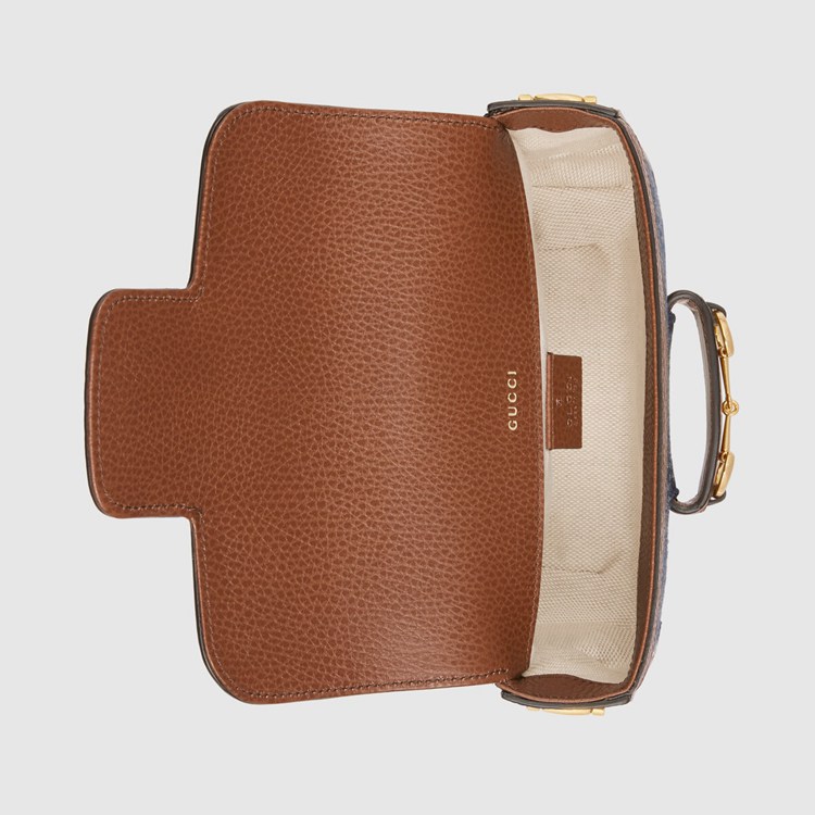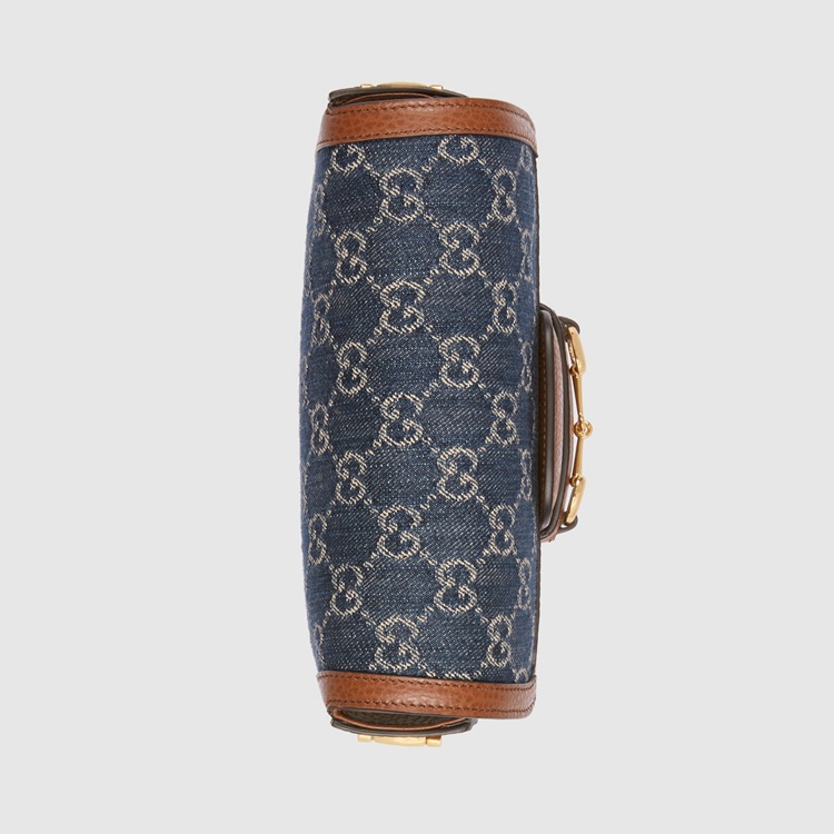 Style 658574 2KQPG 8391 A cult fabric, denim is reimagined through The Gucci lens With The House’s GG motif. The logo infused fabric is paired With The Gucci Horsebit 1955’s recognizable Horsebit hardware. The mini style is completed by a detachable Web shoulder strap in blue and red, adding a versatile feel to The design.