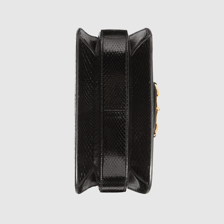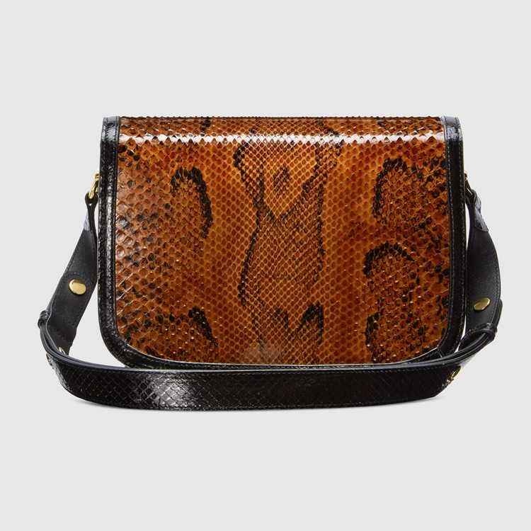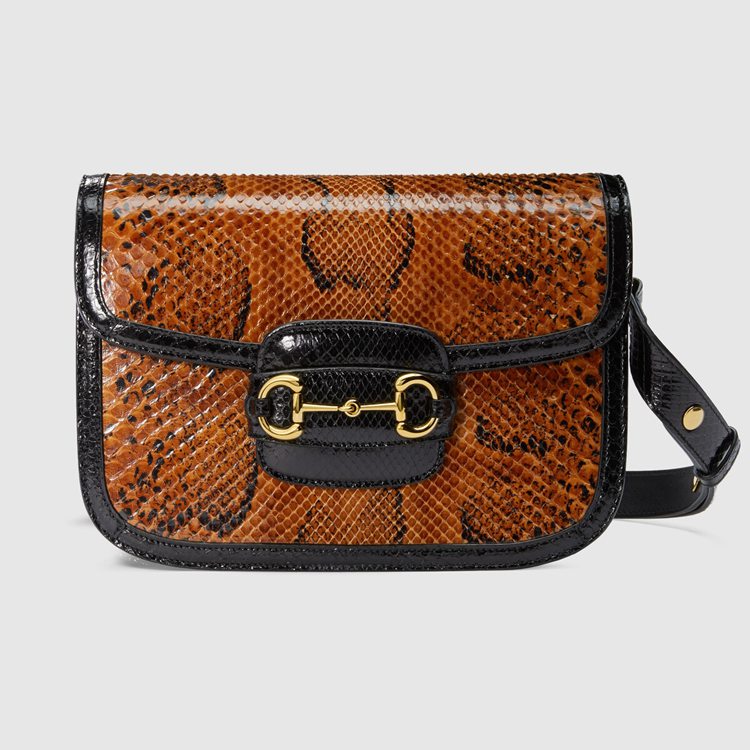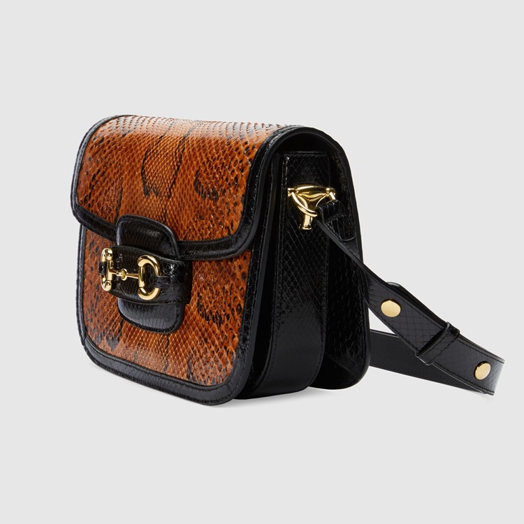 Style 602204 LU3HG 2890Recreated from an archival design, The Gucci Horsebit 1955 bag is introduced in brown and black python For Spring Summer 2020. With The same lines and forms first introduced over six decades ago, The accessory unifies The original details With a modern spirit, highlighting The Horsebit. Part of Gucci’s genetic code, The double ring and bar design has been established as One of The most distinctive elements among The House symbols borrowed from The equestrian world. The small flap shoulder bag is completed With a special mechanism that adjusts The length of The shoulder strap so it can be carried on One shoulder or cross body.