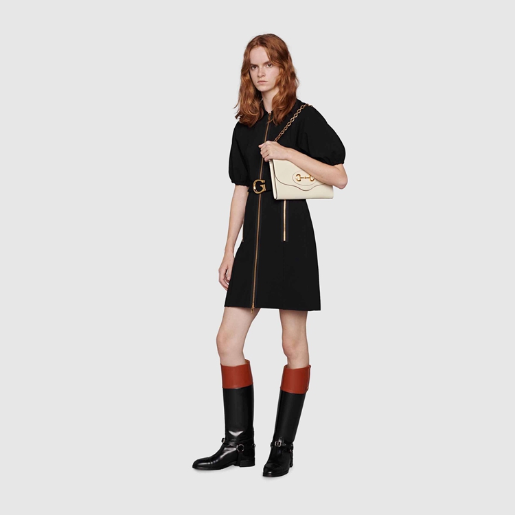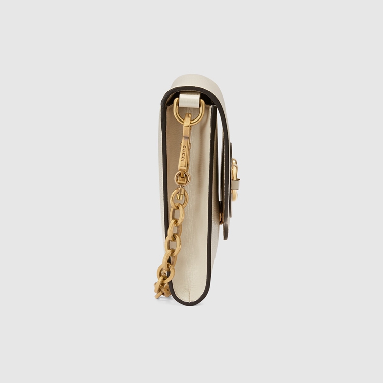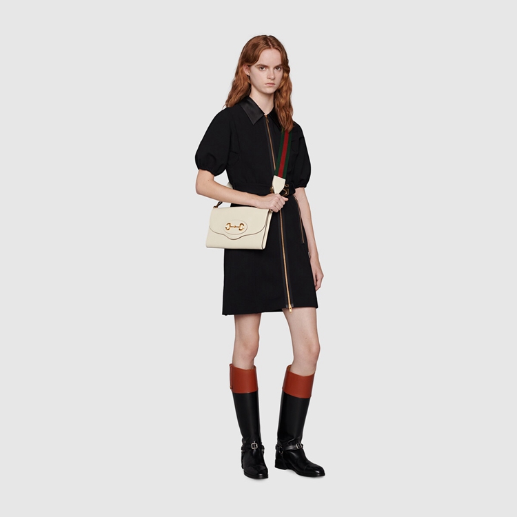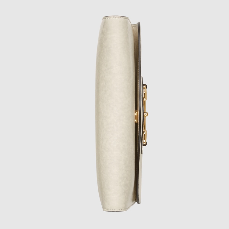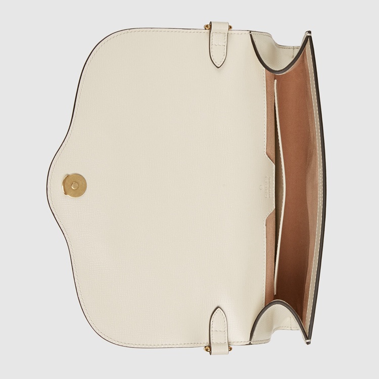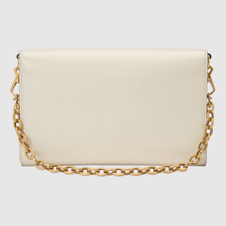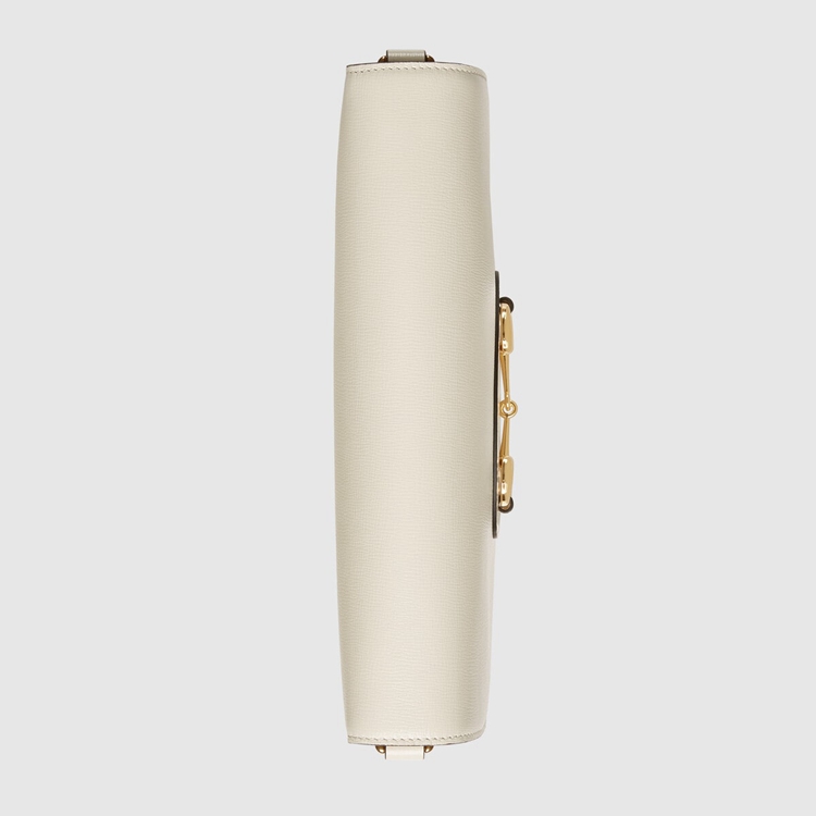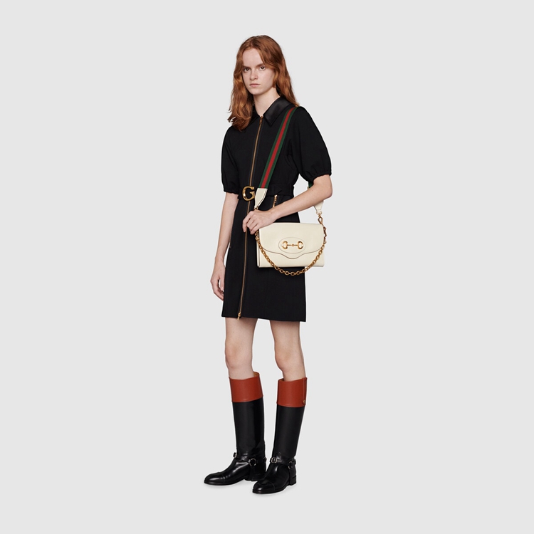 Style 677286 18YSX 9068Embodying The notion of The versatility, The Gucci Horsebit 1955 is enriched With two detachable shoulder straps, One is Crafted in Emblematic green and red Web The other is in Gucci’s recognizable gold-toned chain design. The style is Crafted from white leather and defined by The line’s signature Horsebit hardware.