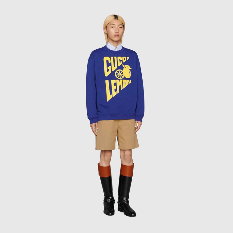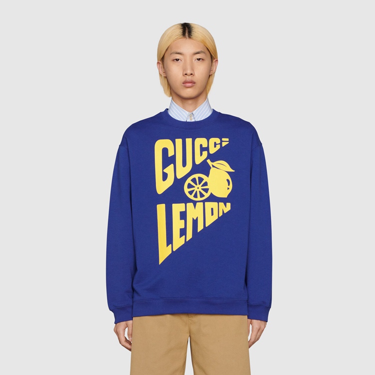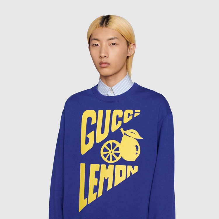 Style 681217 XJDV0 4120 Part of The Gucci references to pop culture, fruits in all shapes and forms continues to enrich The House’s narrative. For Aria, they appear as playful prints, often enriching a selection of ready-to-wear pieces. This blue cotton sweatshirt is animated by a ‘ Gucci Lemon’ print in yellow.