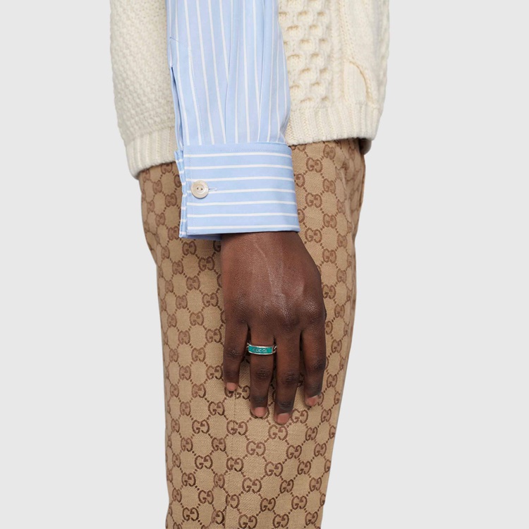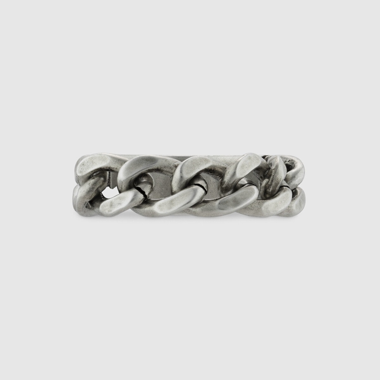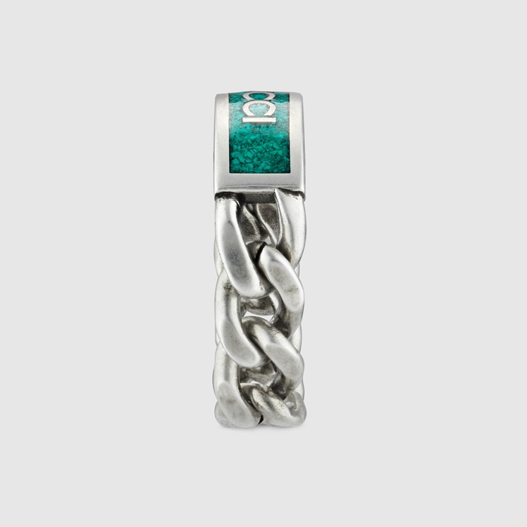 Style 678711 J8410 8183 A sterling silver ring that combines both contemporary and traditional elements. The chunky gourmette chain enriches The design With a casual feel, while an enameled logo detail add an elegant twist.