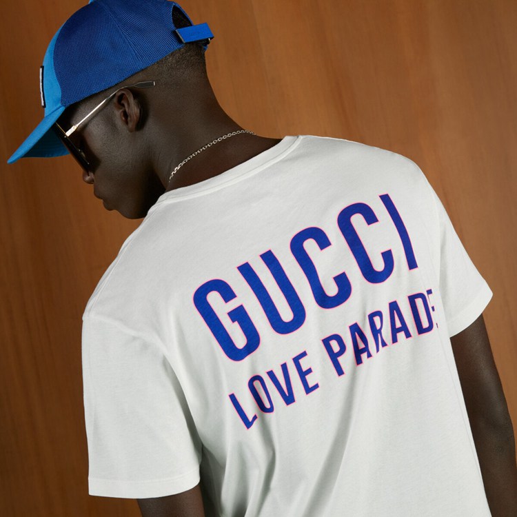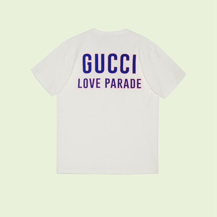 Style 548334 XJEQF 9750 The House continues to explore its ties With pop culture through Gucci Love Parade, a collection where freedom of expression and love are celebrated in all their forms. Representing These values is a series of ready-to-wear pieces featuring The ‘ Gucci Love Parade’ print, just like This cotton T-shirt.