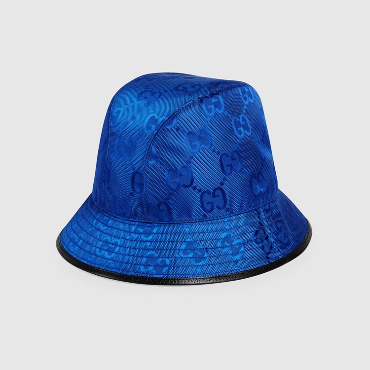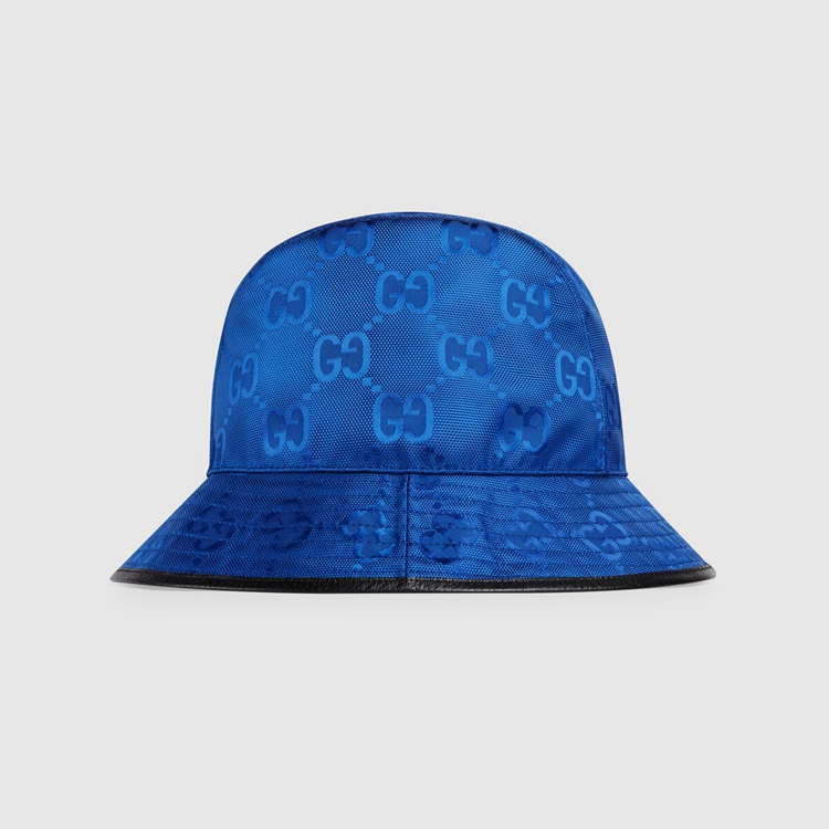 Style 627115 4HK79 4360 The bucket hat is Part of a line of accessories and ready-to-wear made from recycled materials and trims, supporting The House’s commitment to sustainability. Gucci Off The Grid is The first collection from Gucci Circular Lines—a concept created to support The House’s vision For circular production. Designed For those mindful of their environmental impact, Gucci Off The Grid uses recycled, organic, bio-based and sustainably sourced materials. Regenerated nylon, Crafted using recycled sewing thread and trims displays The GG pattern against an opaque background in a vivid blue shade.