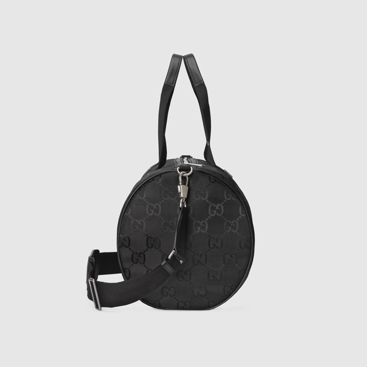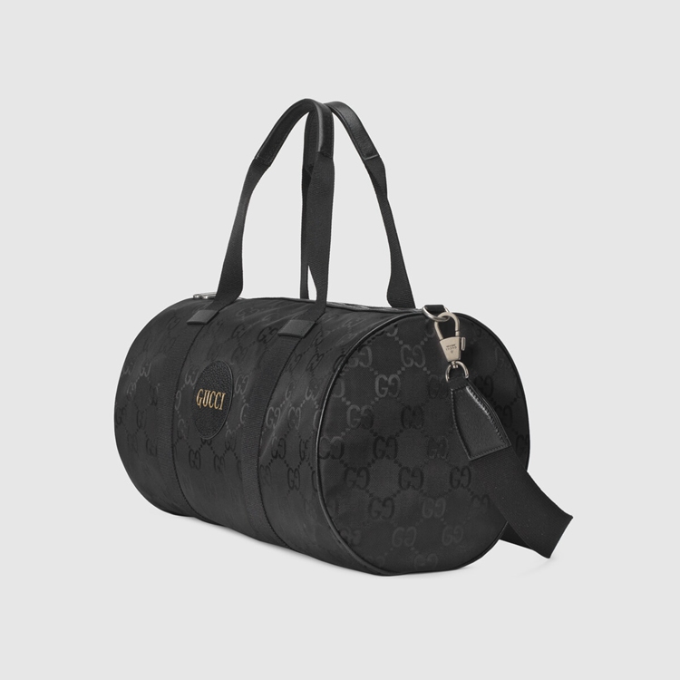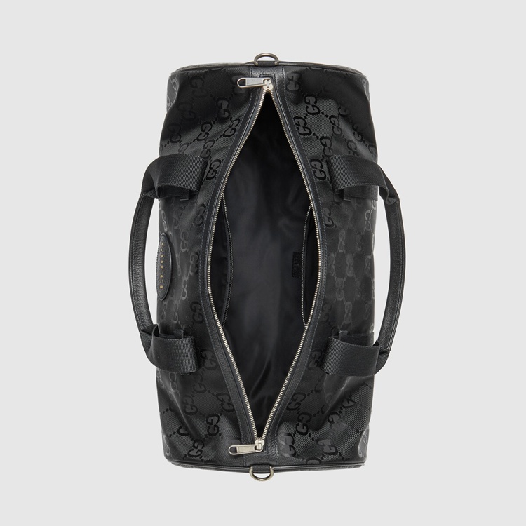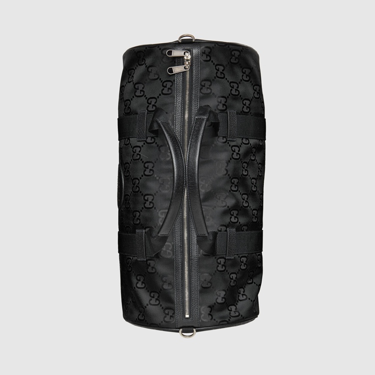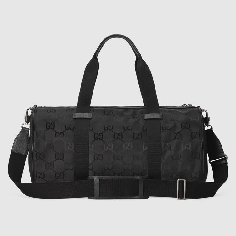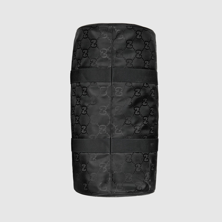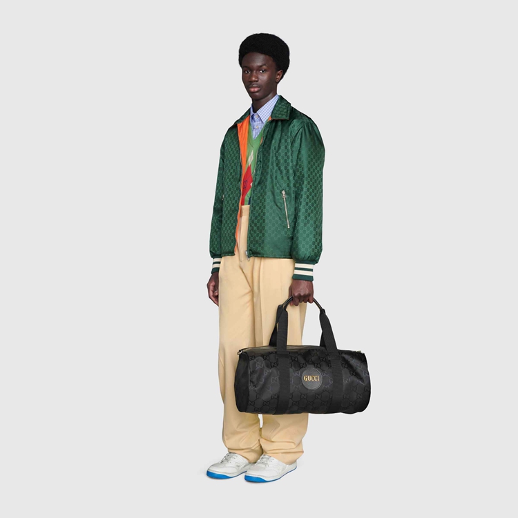 Style 658632 H9HVN 1000 This duffle bag is made from recycled materials and trims, supporting The House’s commitment to sustainability. Gucci Off The Grid is The first collection from Gucci Circular Lines—a concept created to support The House’s vision For circular production. Designed For those mindful of their environmental impact, Gucci Off The Grid uses recycled, organic, bio-based and sustainably sourced materials. Regenerated nylon, Crafted using recycled sewing thread and trims, displays The GG pattern against an opaque background in a deep black.