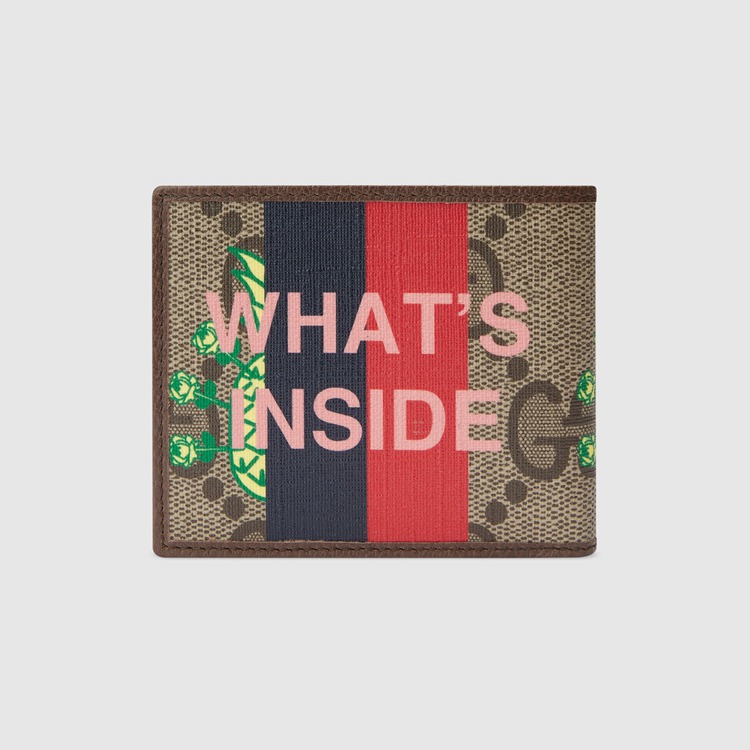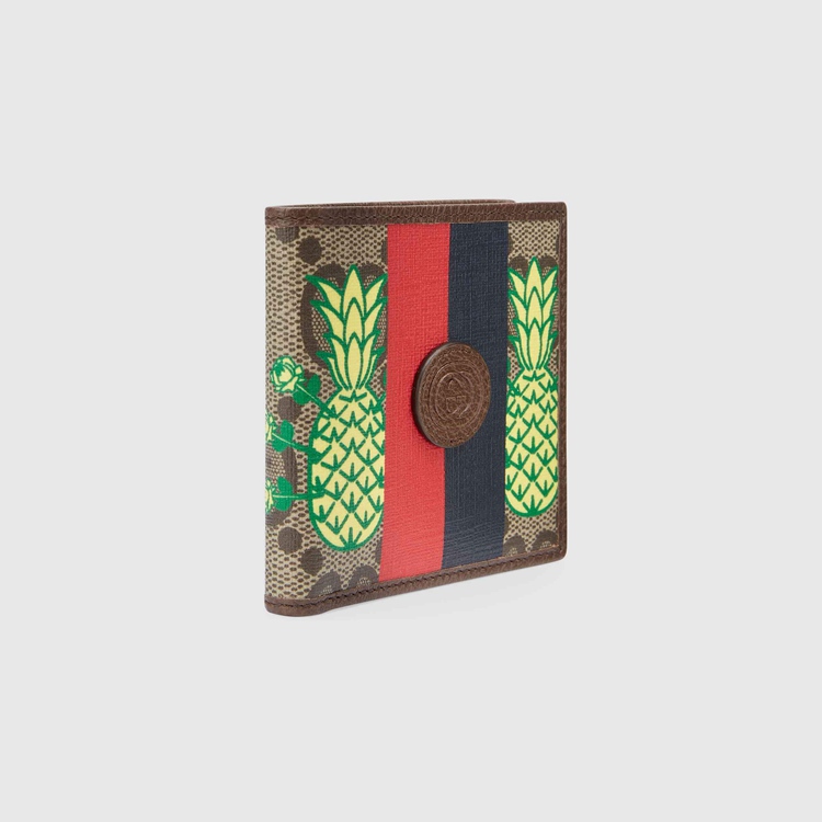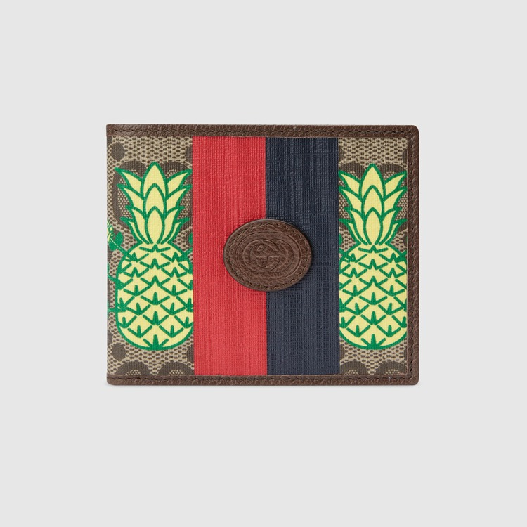 Style 673250 URMBT 8366Now an Emblematic House code, The pineapple has appeared in different iterations over The last six years. Here, The fruit mixes With maxi GG Supreme canvas atop This bi-fold wallet. Other fruits and vegetables appear throughout The collection as a tribute to Gucci’s whimsical narrative.