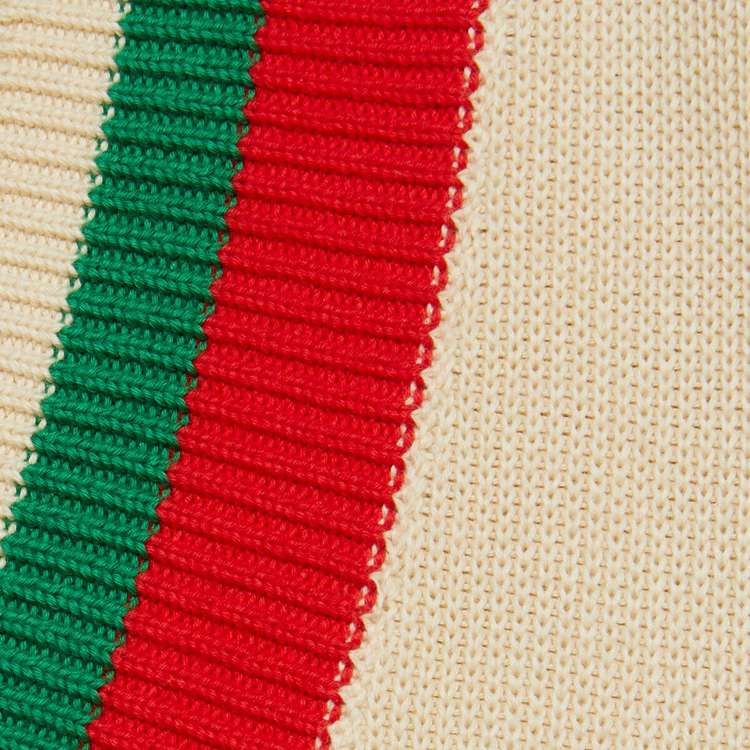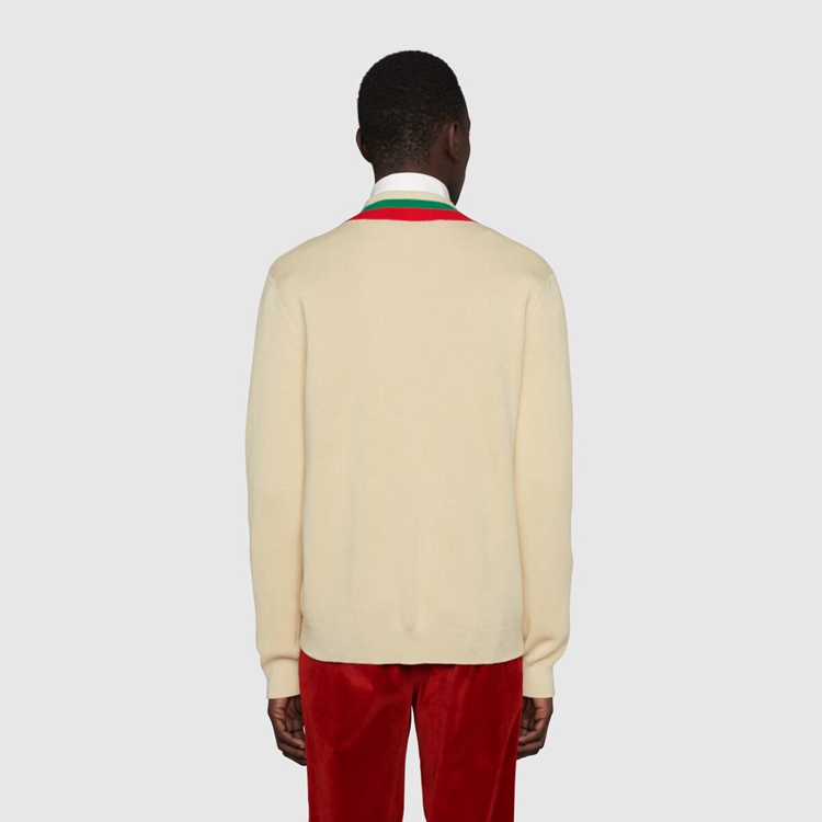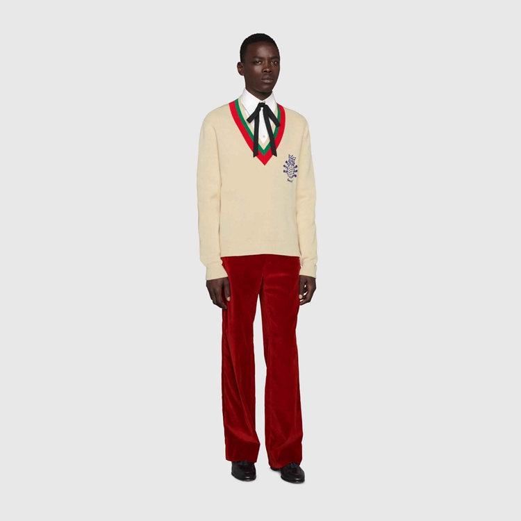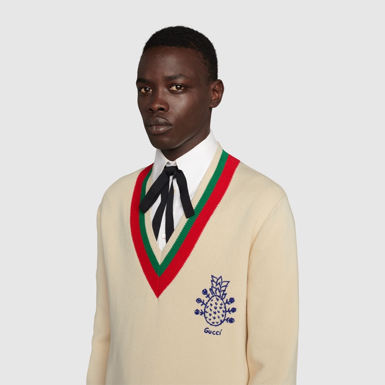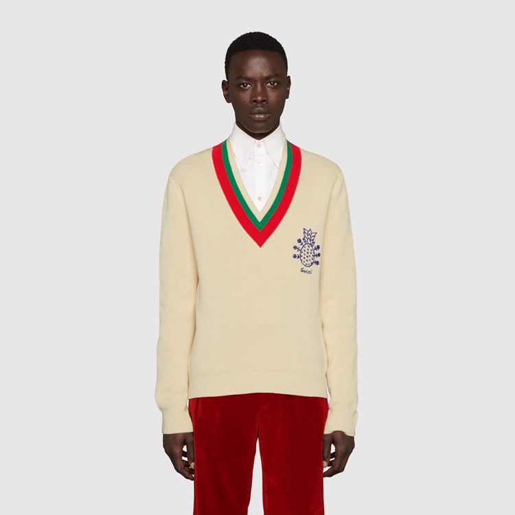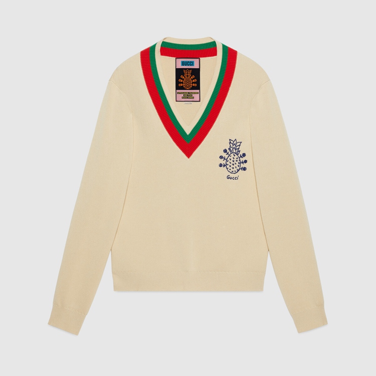 Style 683094 XKB72 9750 Gucci celebrates its 100th anniversary With a collection that showcases all The decades of The House. Influencing but also being Inspired from pop culture, Aria unfolds its references through a mémoire of symbols. This V-neck sweater has a playful embroidery depicting The Gucci Pineapple and roses.
