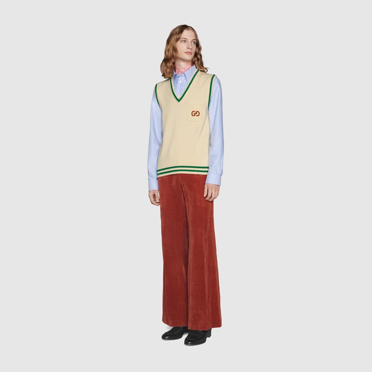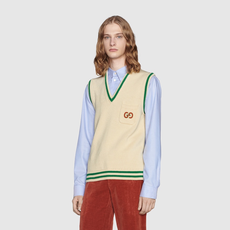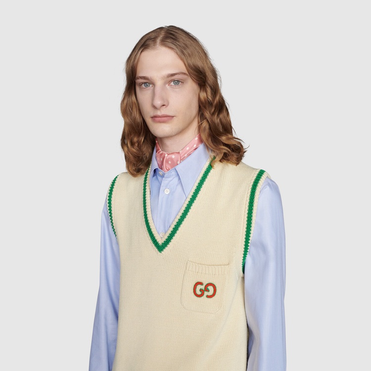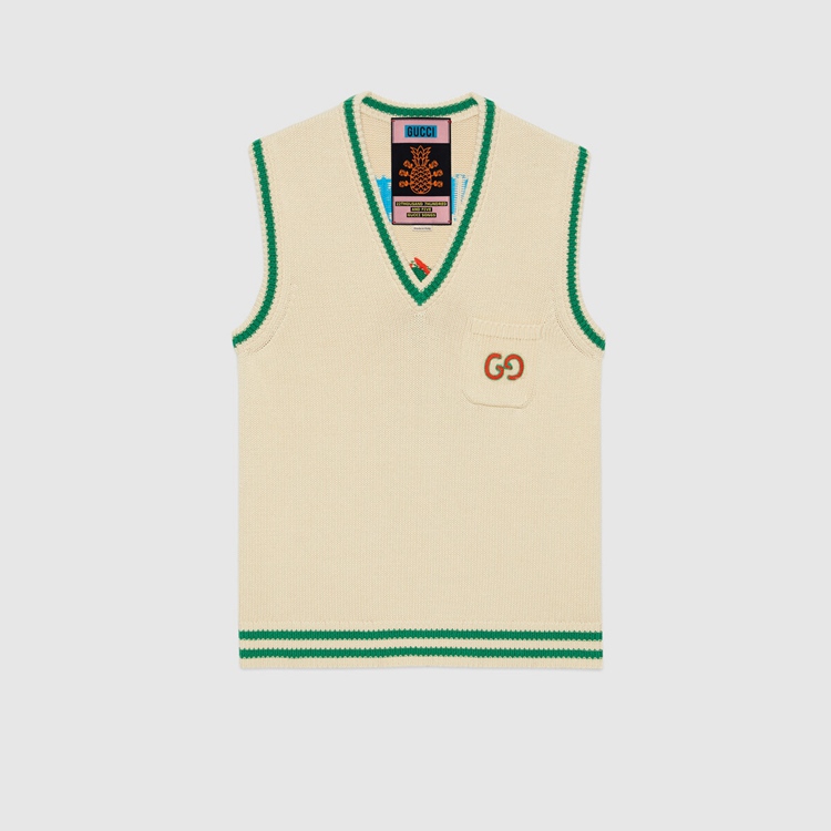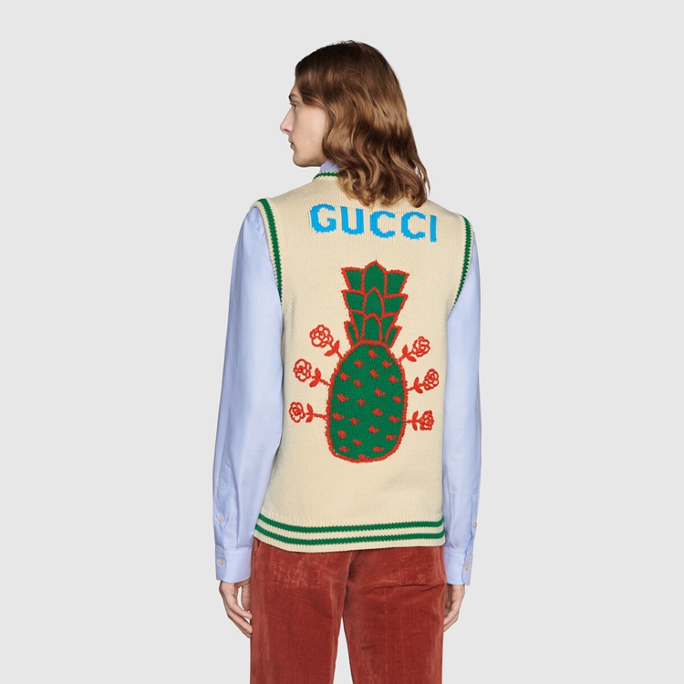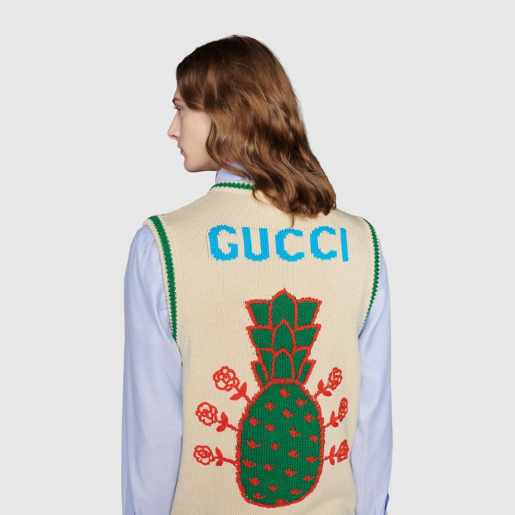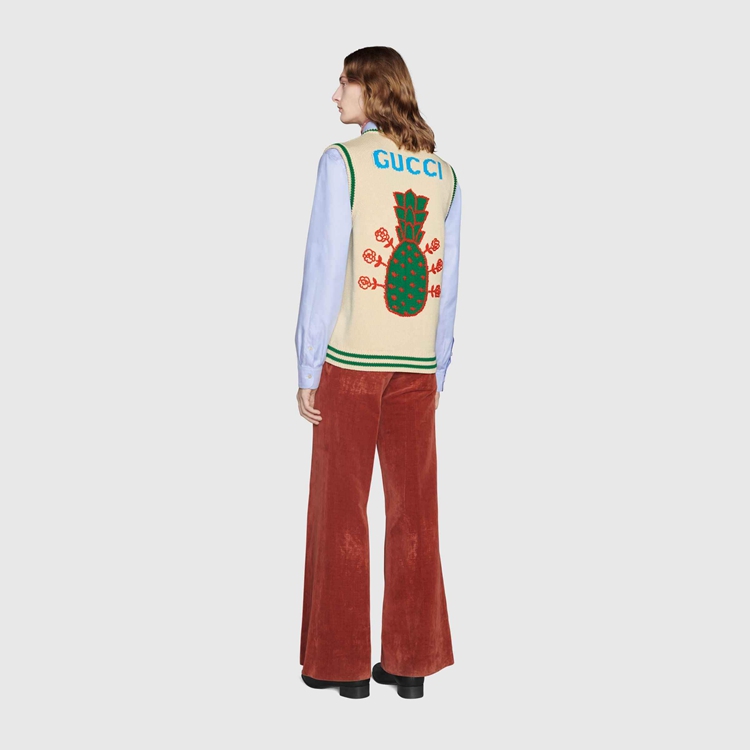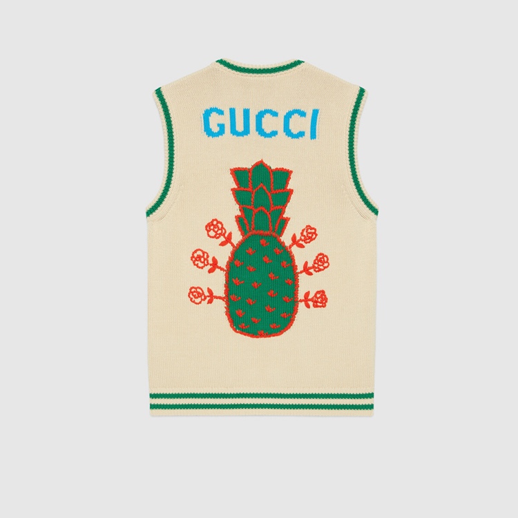 Style 683099 XKB73 9750 Gucci celebrates its 100th anniversary With a collection that showcases all The decades of The House. Influencing but also being Inspired from pop culture, Aria unfolds its references through a mémoire of symbols. This vest have a playful embroidery depicting The Gucci Pineapple and roses.