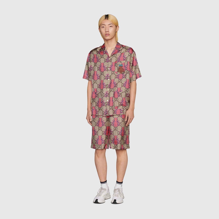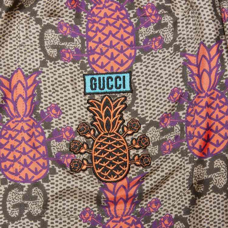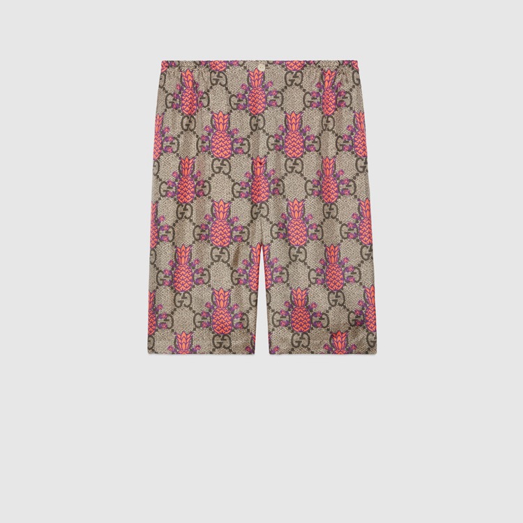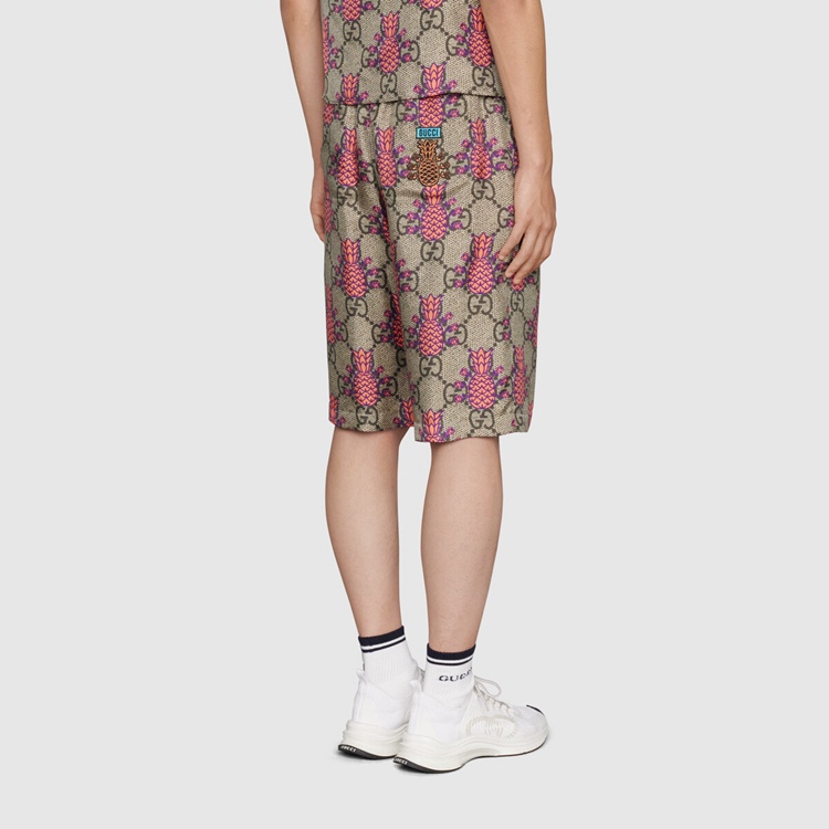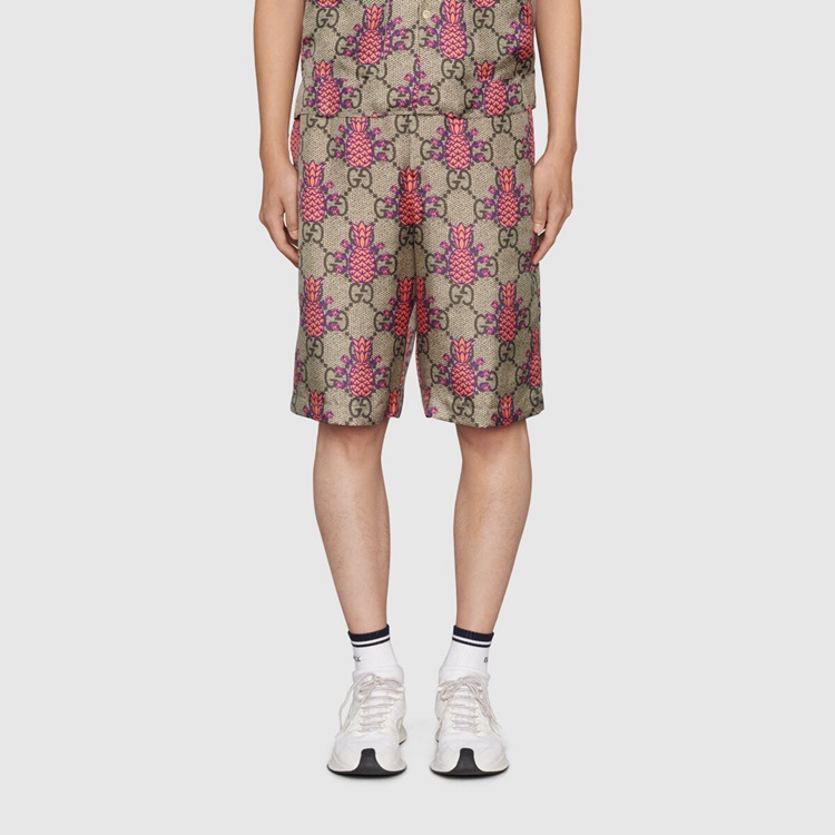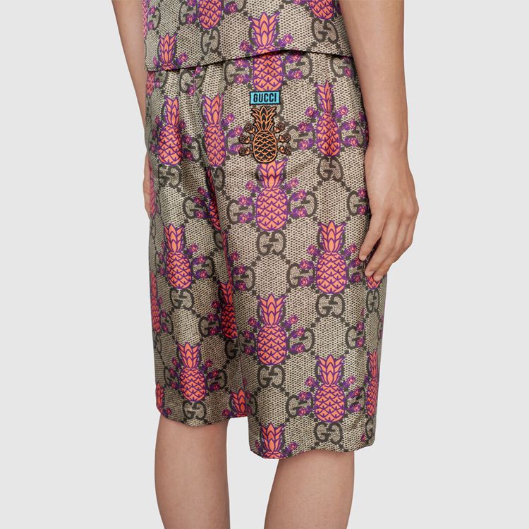 Style 677067 ZAIEJ 2369 Gucci celebrates its 100th anniversary With a collection that showcases all The decades of The House. Influencing but also being Inspired from pop culture, Aria unfolds its references through a mémoire of symbols. These shorts are presented in a playful rendition of The GG Supreme pattern With an allover pineapple motif.