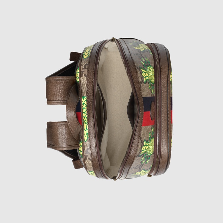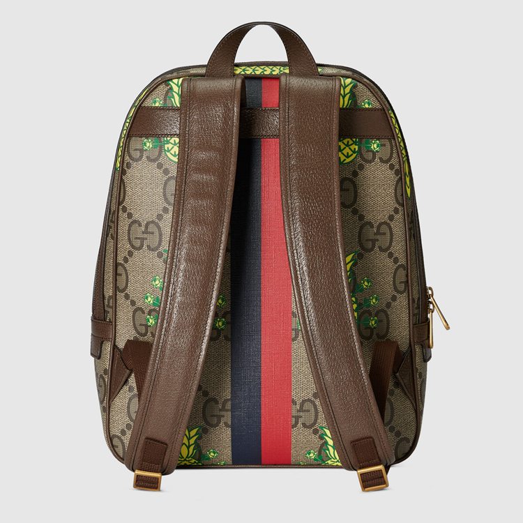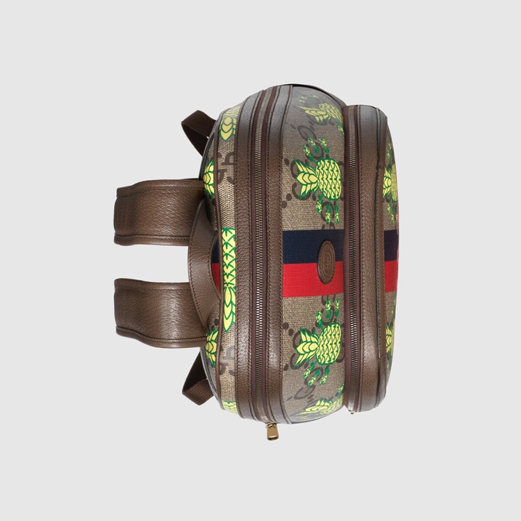 Style 636654 URRBT 8667 This backpack is presented in a playful rendition of The GG Supreme maxi canvas With an allover pineapple motif. The words ‘What’s Inside’ decorate The front, while The blue and red printed stripe—a reinterpretation of The Web, reinforces The symbolic connection to The House.
