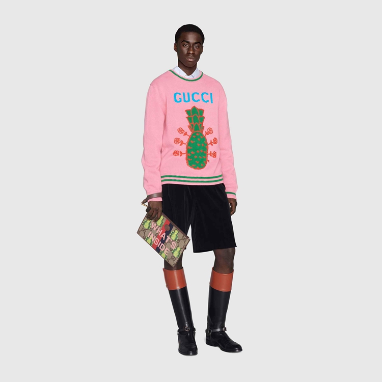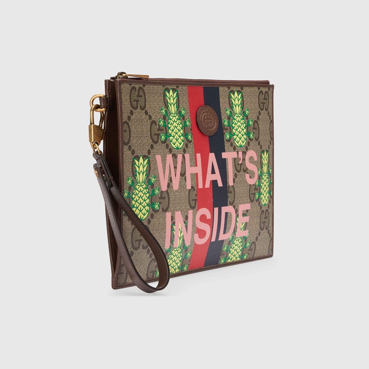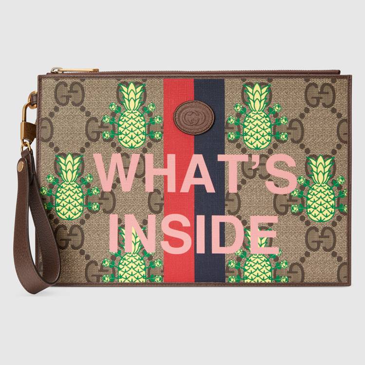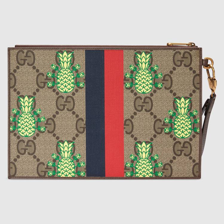 Style 673248 URMBT 8366 Crafted from GG Supreme canvas, This pouch is an invite to ‘guess what’s inside.’ Turning The everyday into a game, The accessory pairs The ironic wordplay With a printed contemporary version of The Web stripe and a colorful pineapple motif.