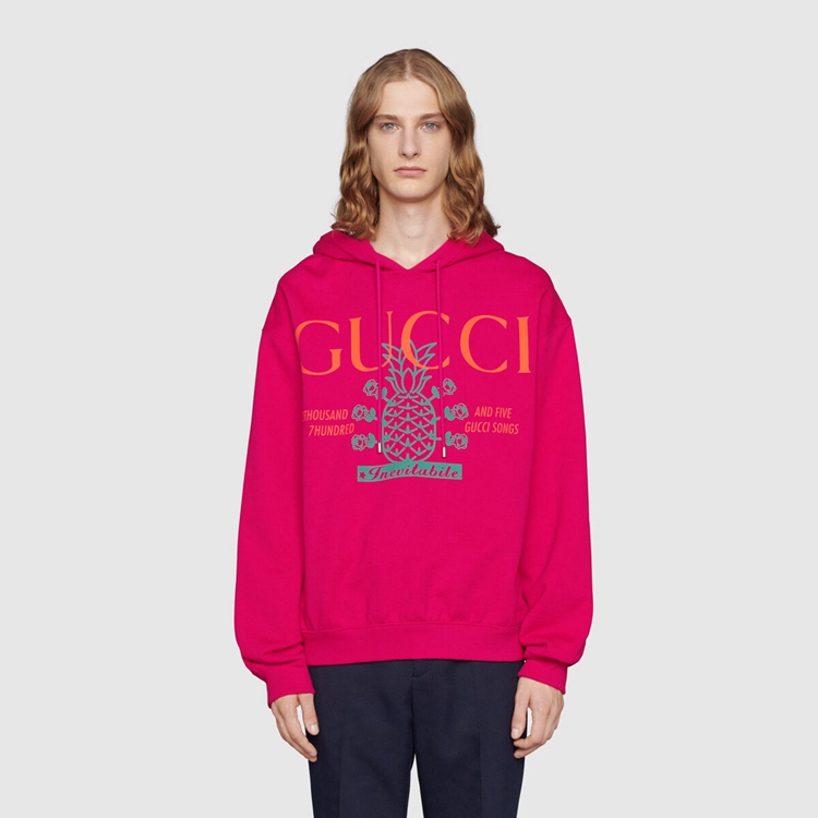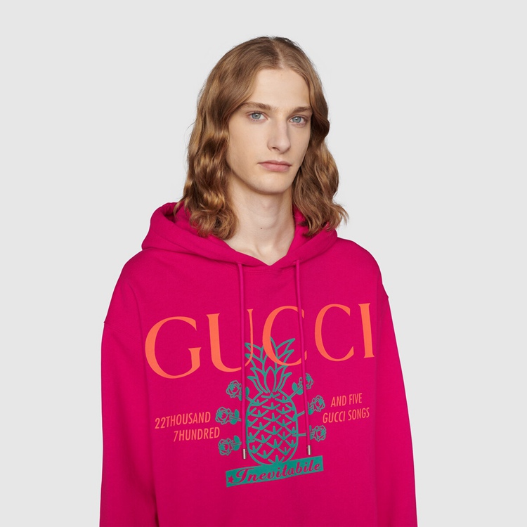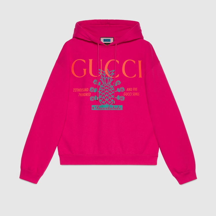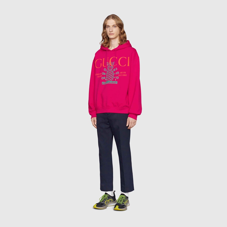 Style 674900 XJD22 5564 Gucci celebrates its 100th anniversary With a collection that showcases all The decades of The House. Influencing but also being Inspired from pop culture, Aria unfolds its references through a mémoire of symbols. This sweatshirt has a playful print depicting The Gucci Pineapple and roses.