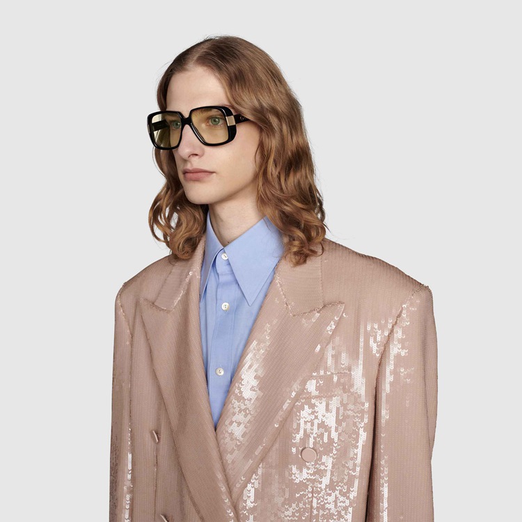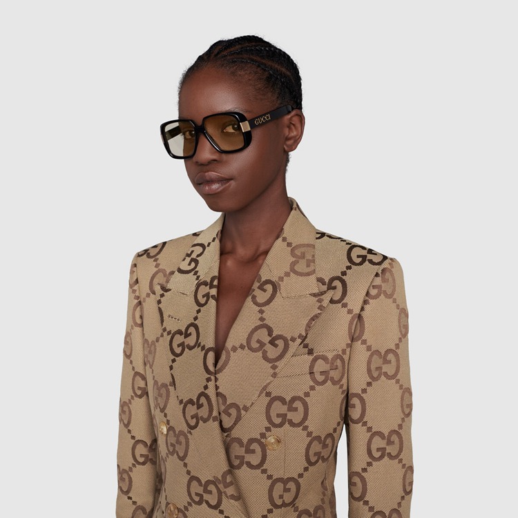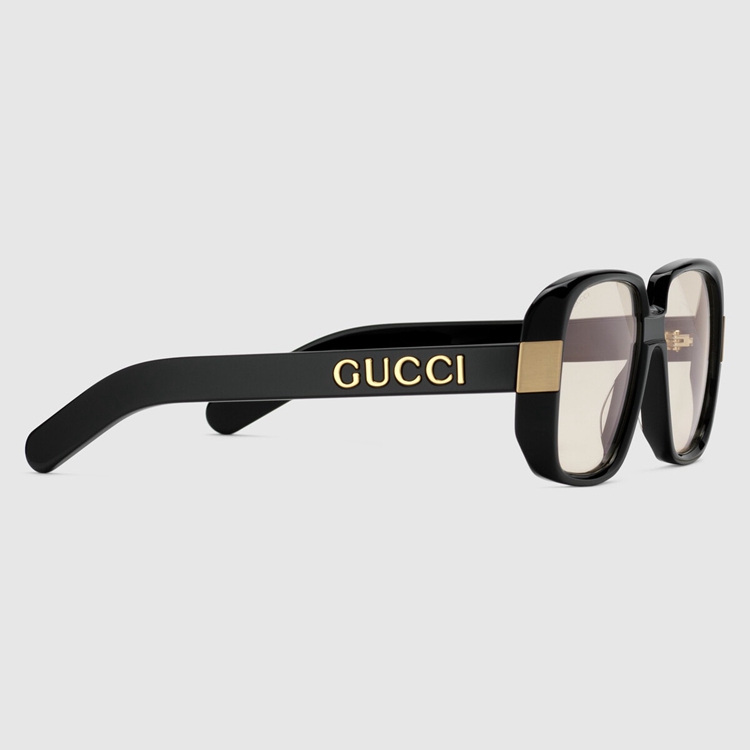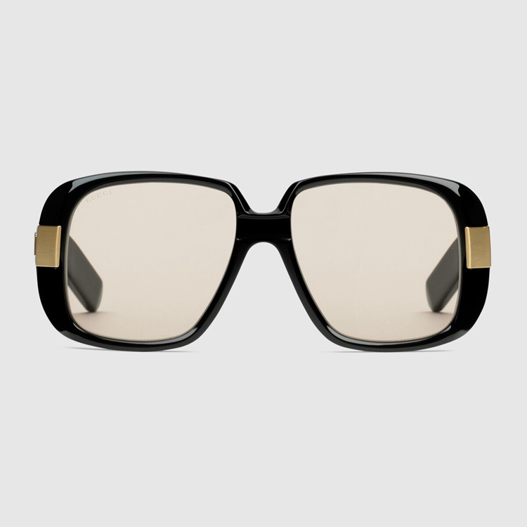 Style 691345 J0740 8074 Crafted from black acetate, These rectangular-frame sunglasses are characterized by a shiny gold-toned metal plate on The frame and bold Gucci lettering along The side of The temples. A light yellow lens completes The style With a Retro touch.