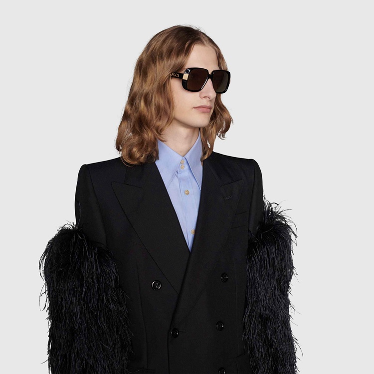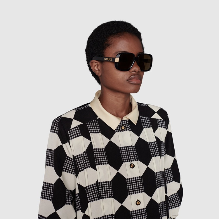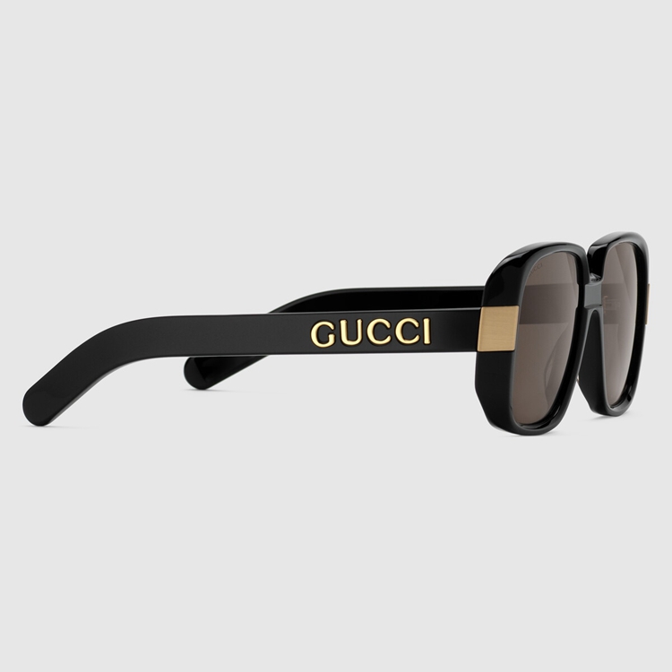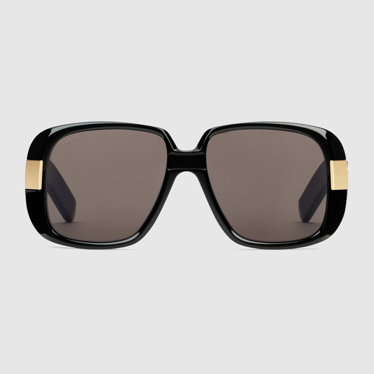 Style 691345 J0740 8012 Crafted from black acetate, These rectangular-frame sunglasses are characterized by a shiny gold-t One metal plate on The frame and bold Gucci lettering along The side of The temples. A solid grey lens completes The style.