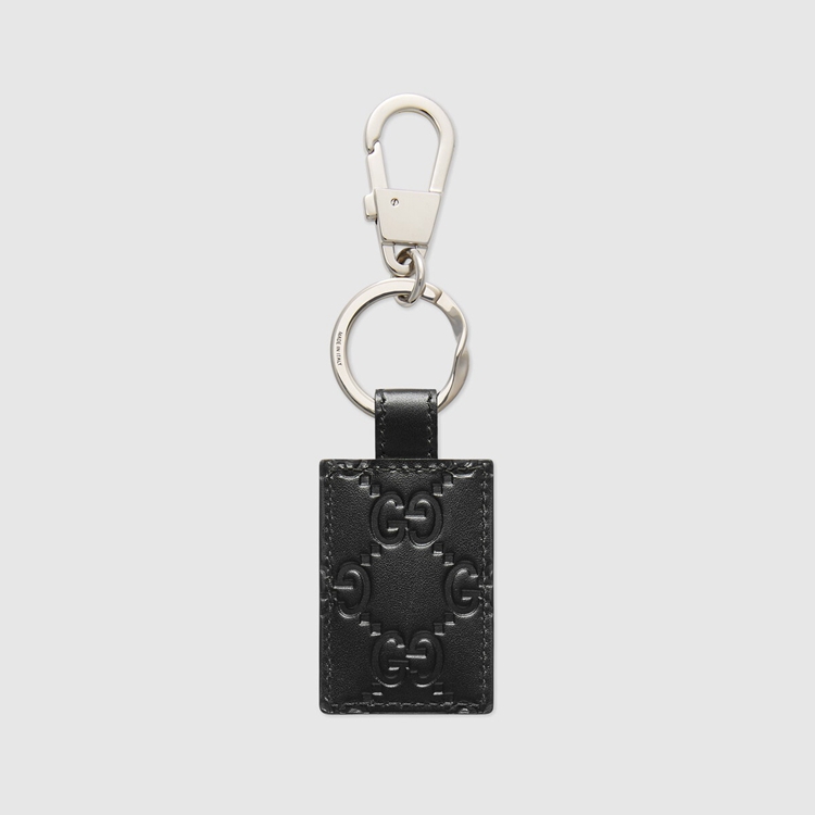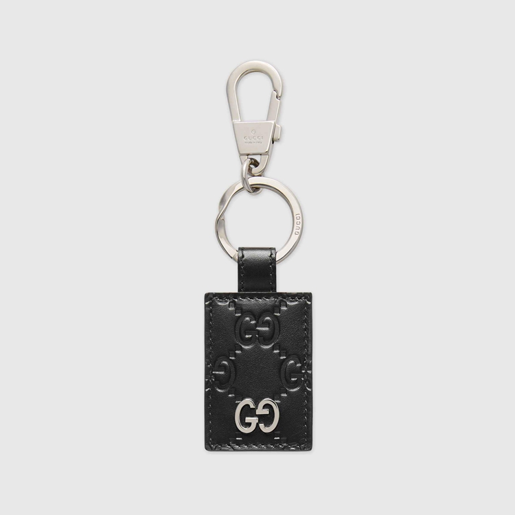 Style 478136 CWC1N 1000 A keychain made in heat debossed Gucci Signature leather With a defined print and firm texture. Features a New GG metal detail that reflects The Gucci Signature motif.