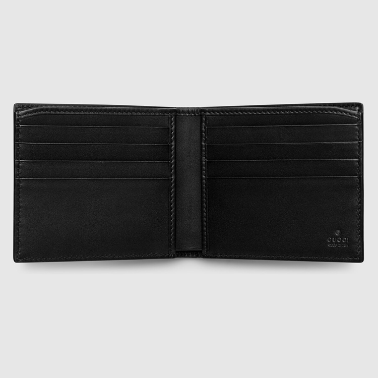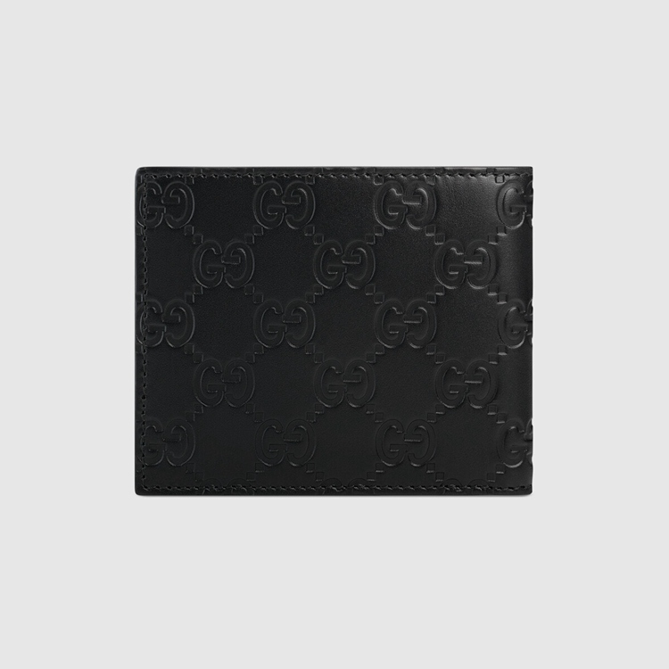 Style 473916 CWC1N 1000 A bi-fold wallet made in heat debossed Gucci Signature leather With a defined print and firm texture. At The corner is a GG metal detail that reflects The Gucci Signature motif.