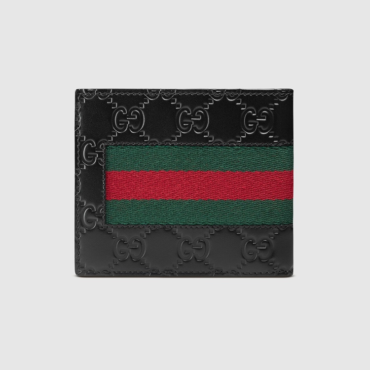 Style 408827 CWCLN 1060 A combination of two of Gucci’s most recognisable icons: The GG motif and The Web. This bi-fold wallet is made in heat debossed Gucci Signature With Gucci Web stripe detail.