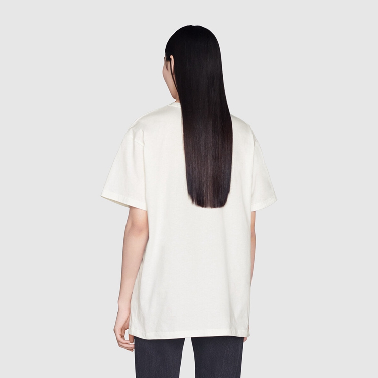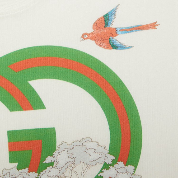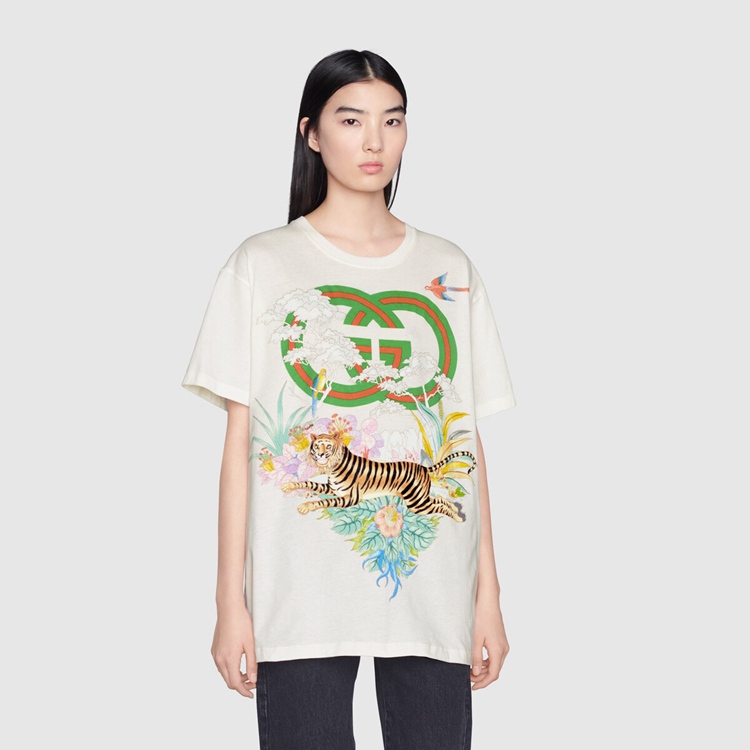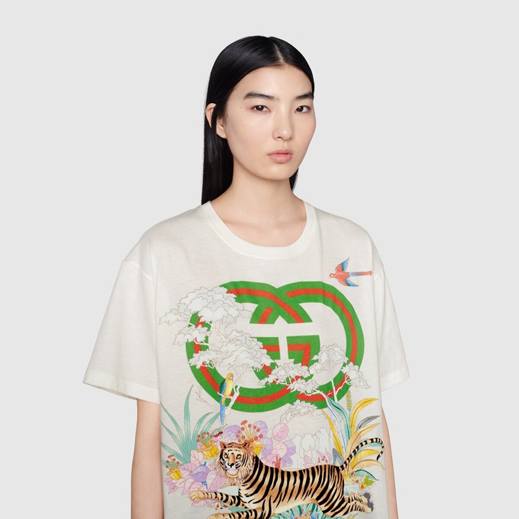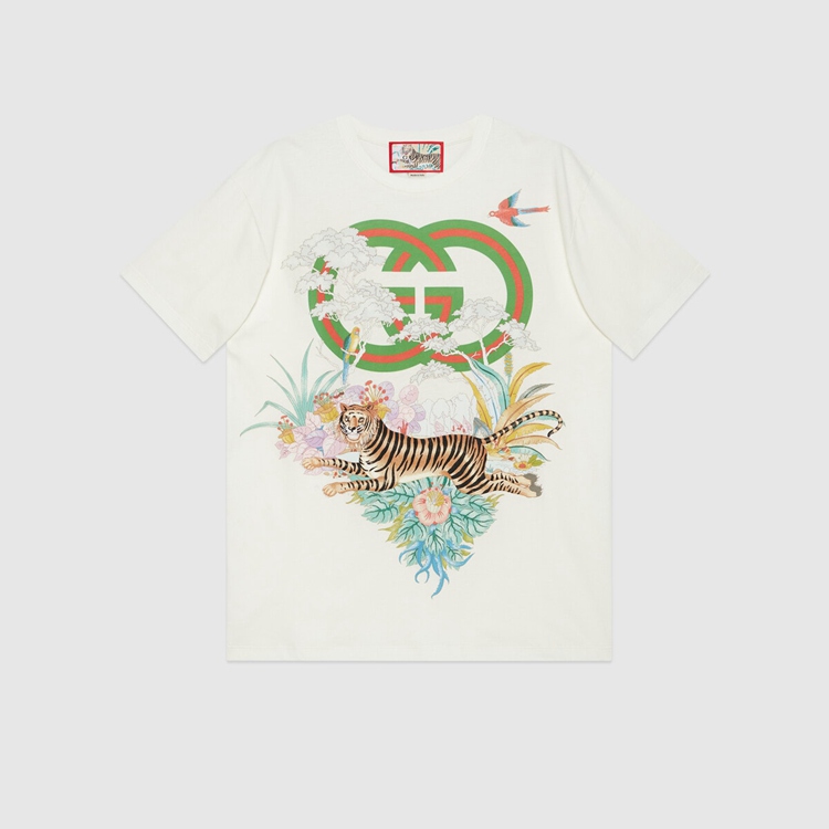 Style 615044 XJD4G 9095 This off-white T-shirt pairs a playful jumping tiger With The Interlocking G. References to The feline are often seen throughout The Creative Director’s collections as an expression of The House’s fascination With The wild beauty of The natural world.