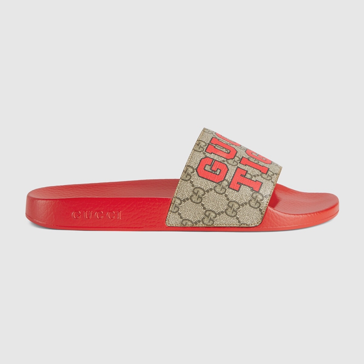 Style 687612 UTH00 9749 This pair of slide sandals is characterized by The printed motto ‘ Gucci Tiger.’ References to The feline are often seen throughout The Creative Director’s collections as an expression of The House’s fascination With The wild beauty of The natural world.
