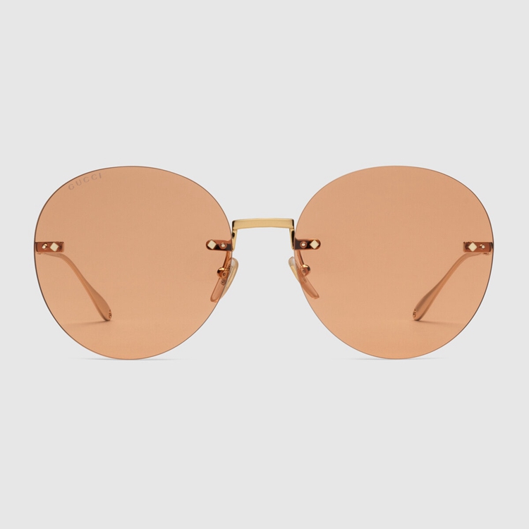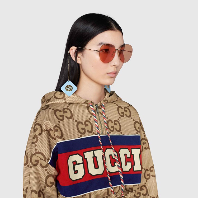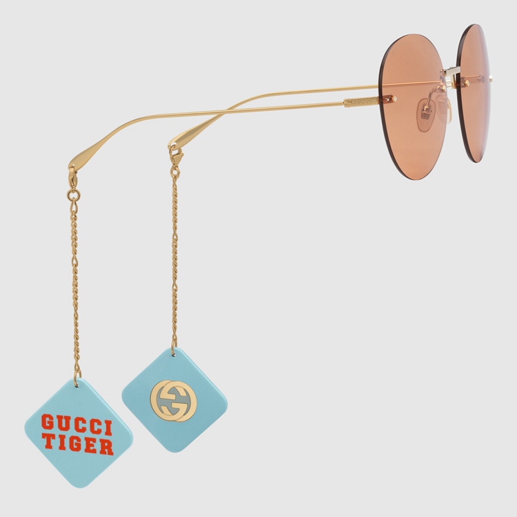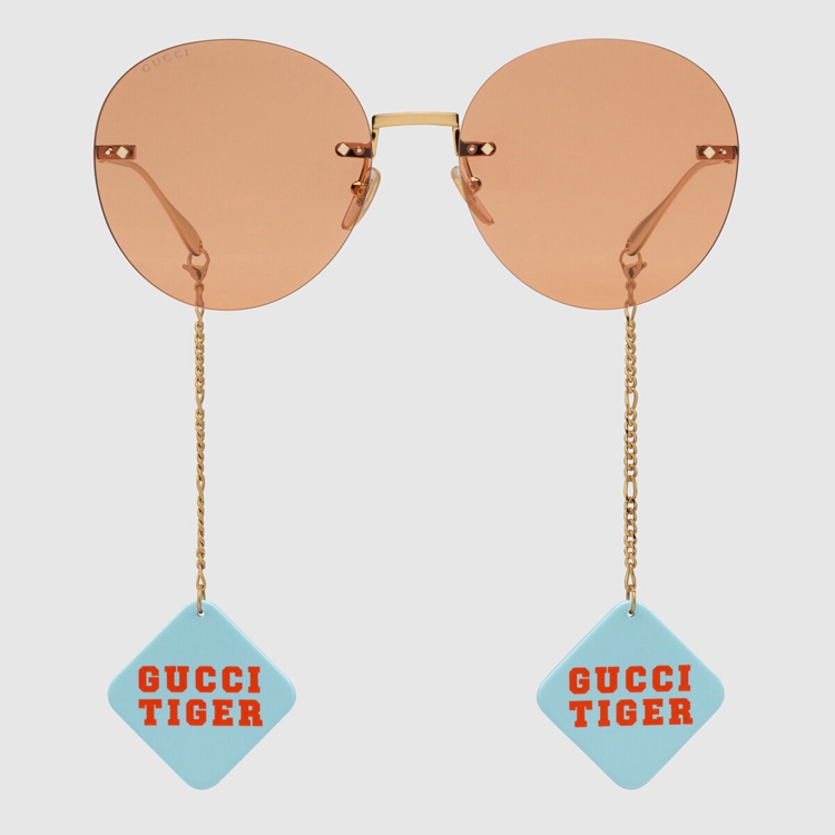 Style 690989 I3330 8075 Gucci presents a pair of round-frame sunglasses With detachable elements that combine vintage and contemporary influences. The removable geometric charms channel The House’s playful spirit With The Interlocking G on The front, while The dedicated ‘ Gucci Tiger’ script appears on The back.