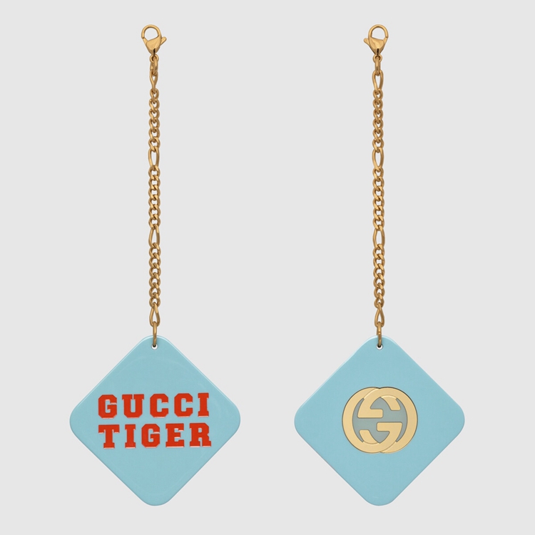 - Shiny gold-t One metal temples With blue detachable geometric charms and an GG interlocking logo on front and Gucci Tiger script on The back