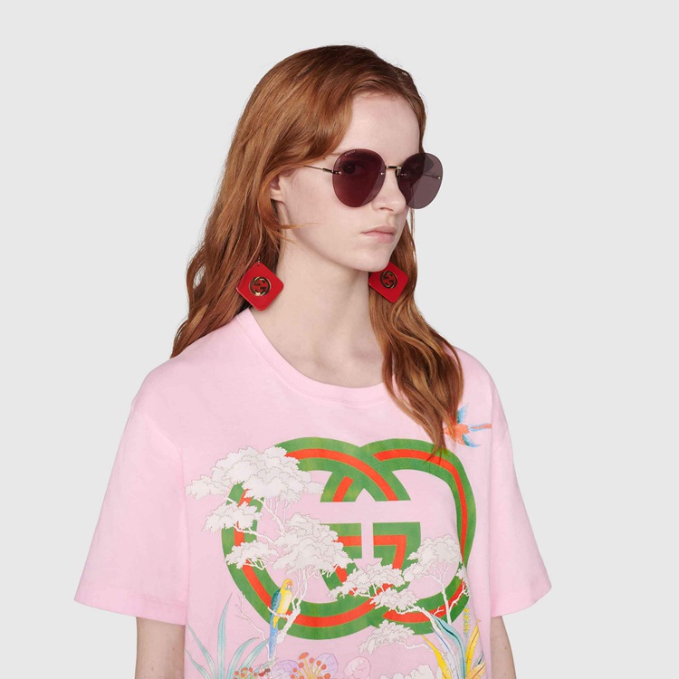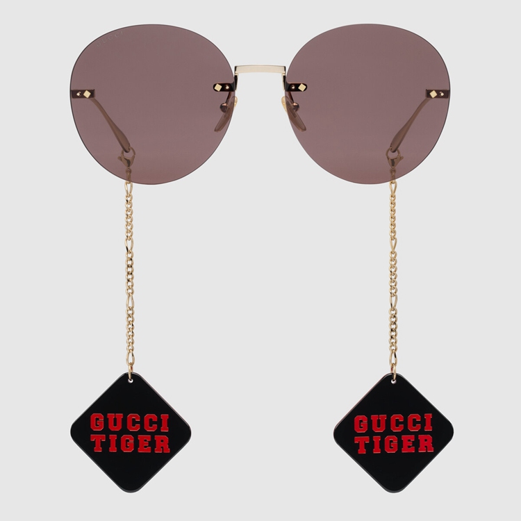Style 690989 I3330 8021 Gucci presents a pair of round-frame sunglasses With detachable elements that combine vintage and contemporary influences. The removable geometric charms channel The House’s playful spirit With The Interlocking G on The front, while The dedicated ‘ Gucci Tiger’ script appears on The back.