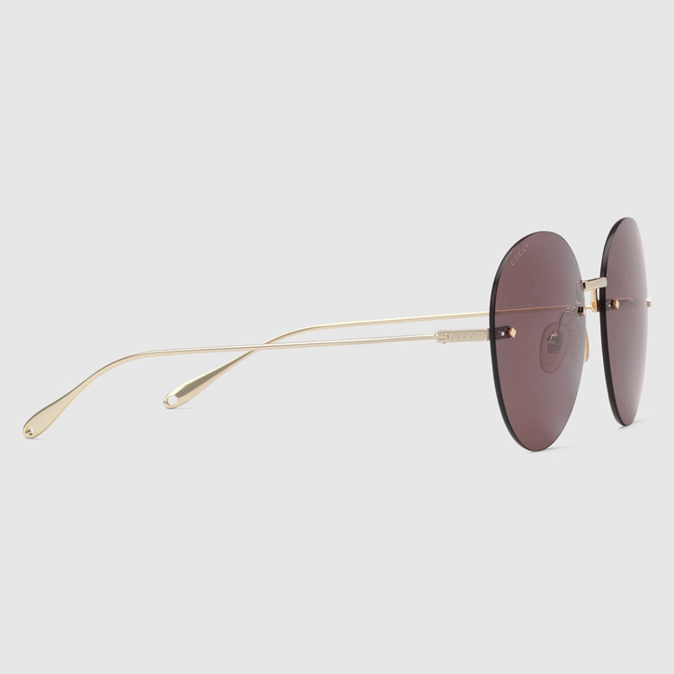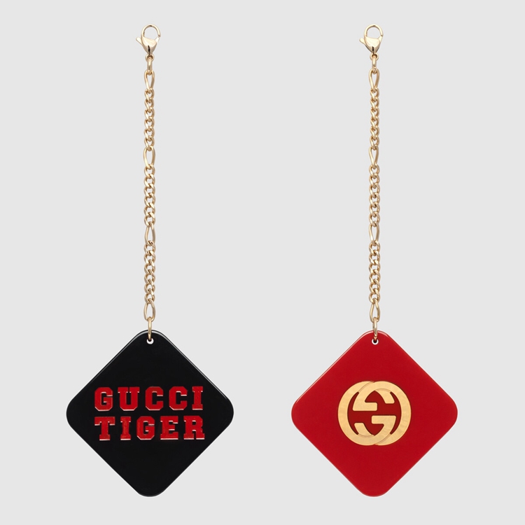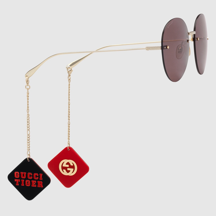 - Shiny gold-t One metal temples With red detachable geometric charms and an GG interlocking logo on front and Gucci Tiger script on The back