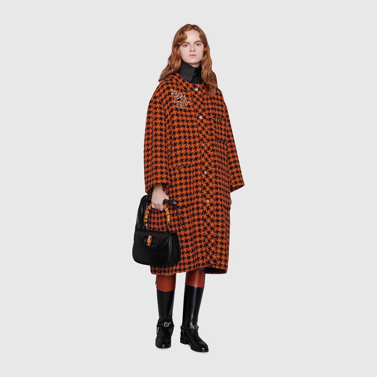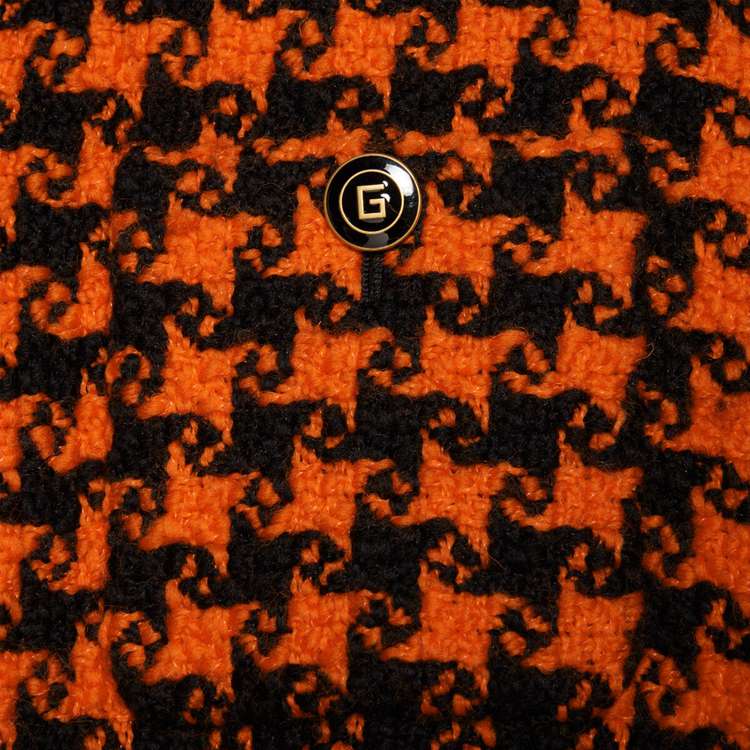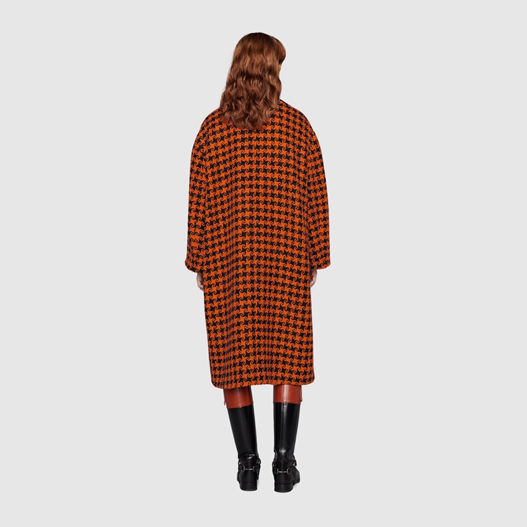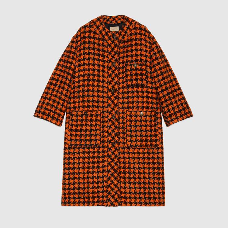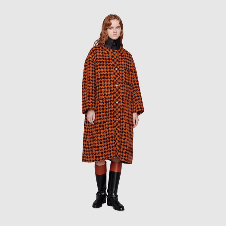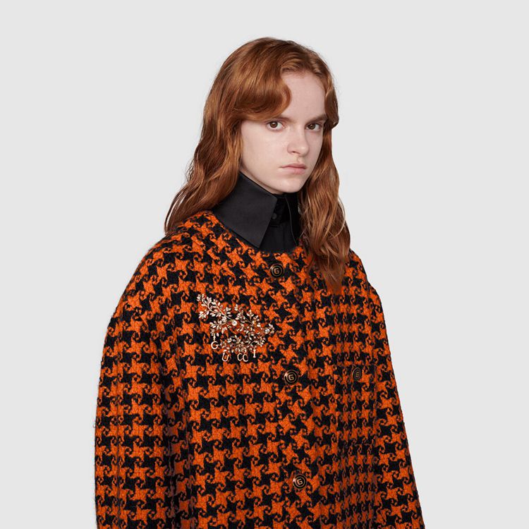 Style 664249 ZAHMO 1565 A New take on a Classic pattern, houndstooth is proposed in orange and black For This wool coat. The House continue to experiment With traditional motifs through unexpected details and contemporary silhouettes.