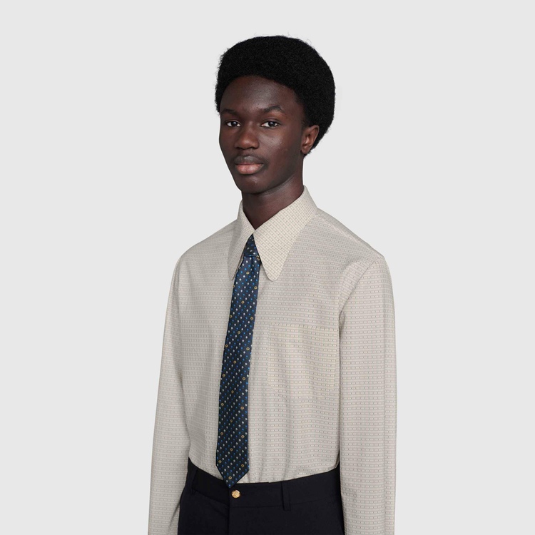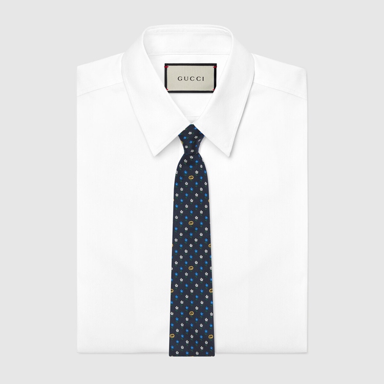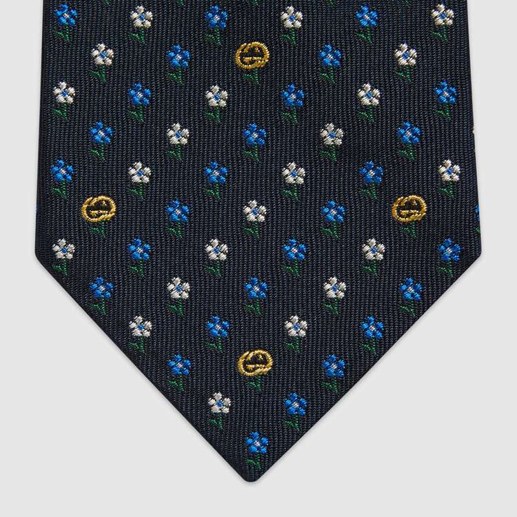 Style 643815 4E002 4068 The Interlocking G motif is mixed With a flower design on The tie For a graphic jacquard pattern on dark blue silk. House codes continue to enrich The House as New details and designs.