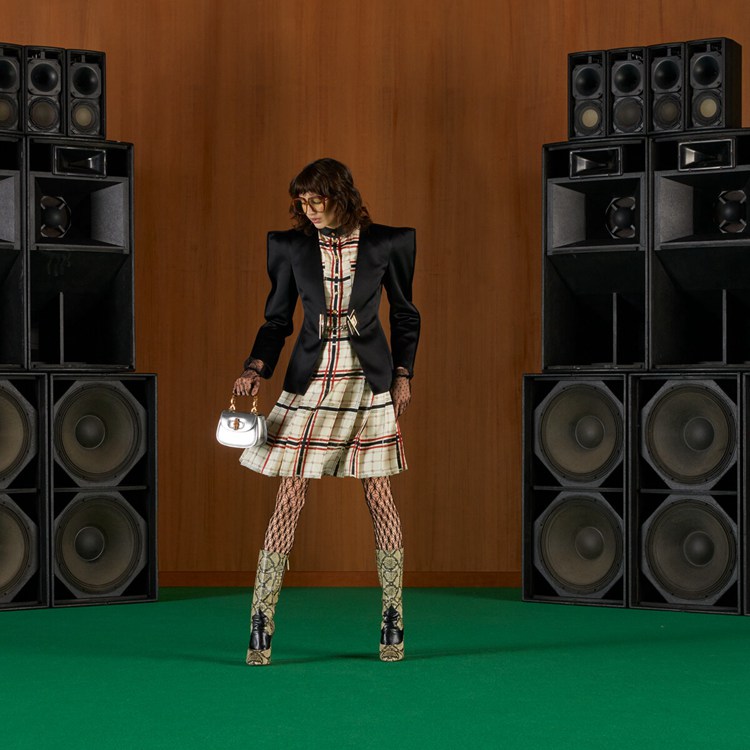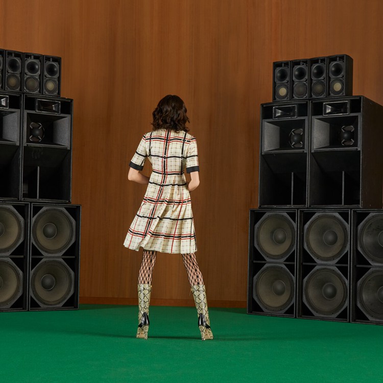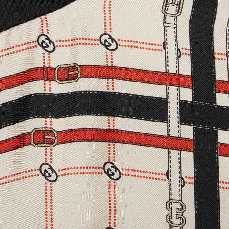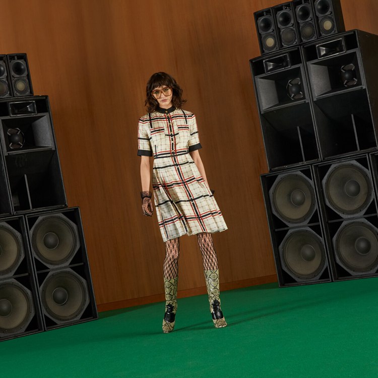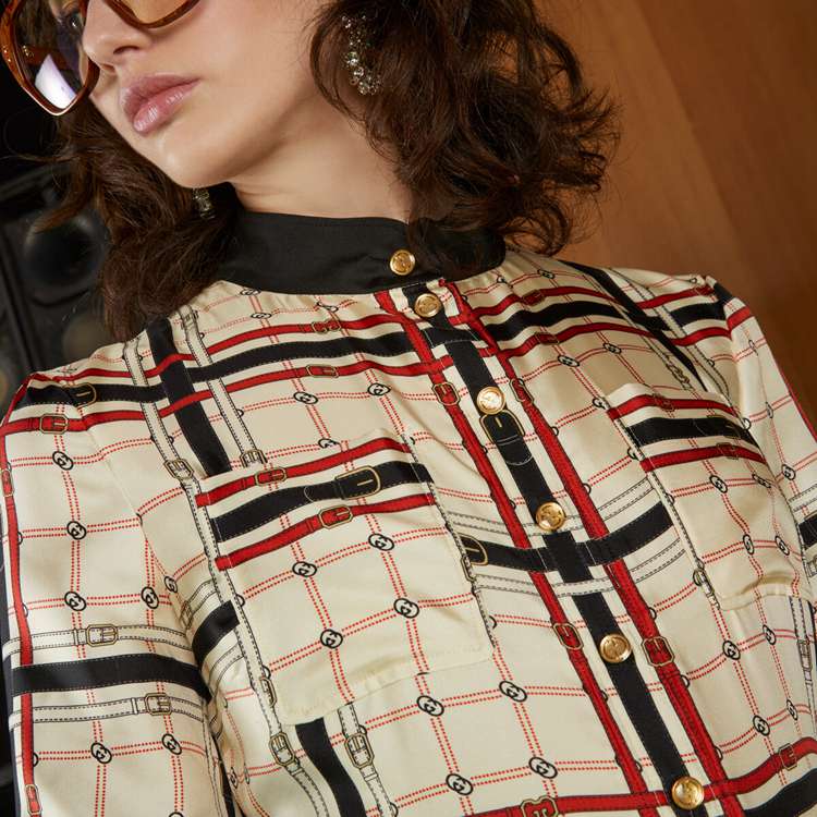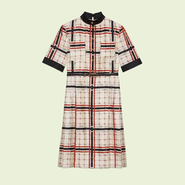 Style 691045 ZAIYO 9791 For Gucci Love Parade, Classic styles are refashioned in contemporary silhouettes and mixed With eclectic references. Inspired by vintage silk scarves, The Interlocking G chain check print gives This dress a Retro touch.