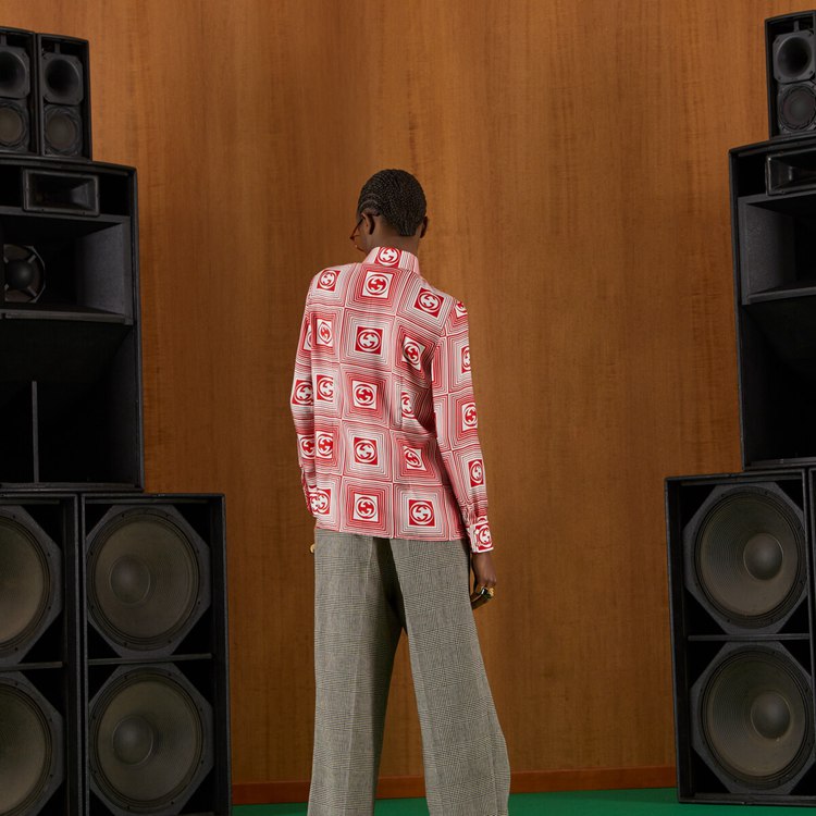 Style 690884 ZAITK 9376 One of The House’s most recognizable codes, The Interlocking G is representative of Founder Guccio Gucci’s initials and is continually reintroduced season after season. Here, The symbol is encapsulated Within a checkerboard print, creating a slightly optical motif.
