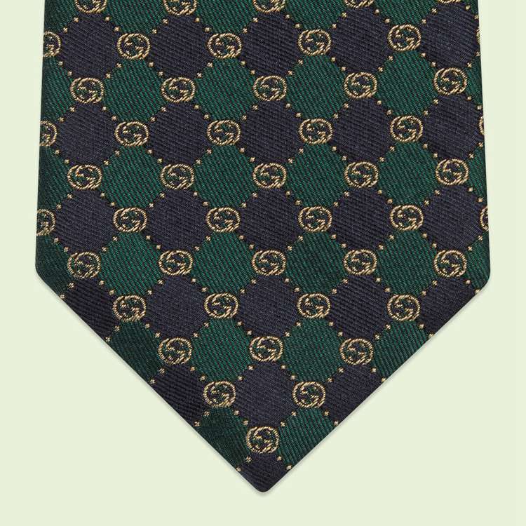 Style 695319 4E002 3178House logos continue to be The defining feature of men’s silk accessories. The Interlocking G, representing The initials of Founder Guccio Gucci, decorates This green check silk tie as an allover jacquard detail in contrasting ivory.