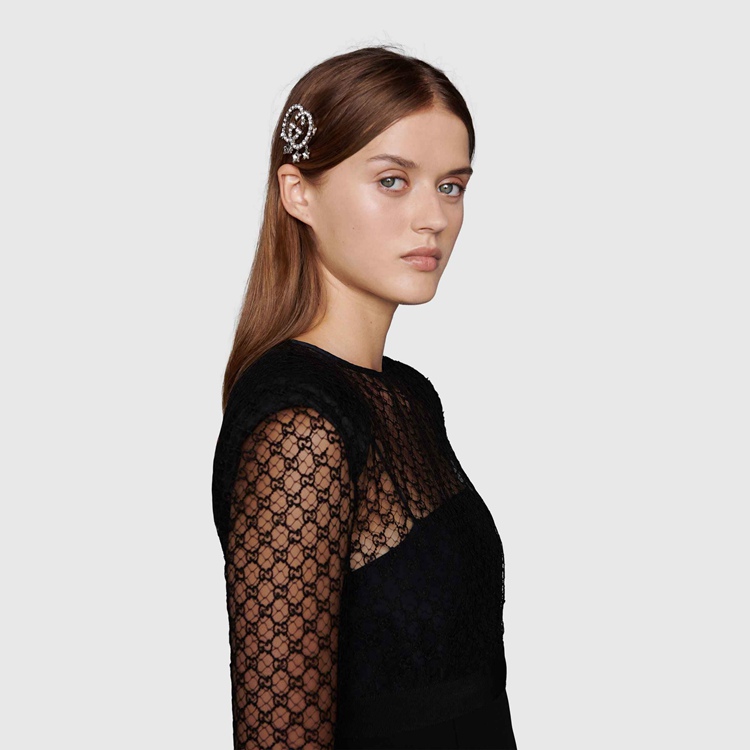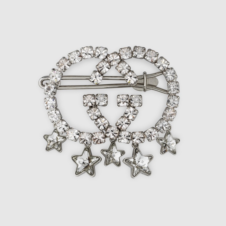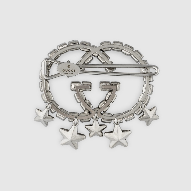 Style 679008 J3F42 8162Playful accessories continue to enrich The House narrative. This hair slide, Crafted from palladium metal, takes The shape of The signature Interlocking G in clear crystals, while sparkling stars complete The design With a whimsical feel.