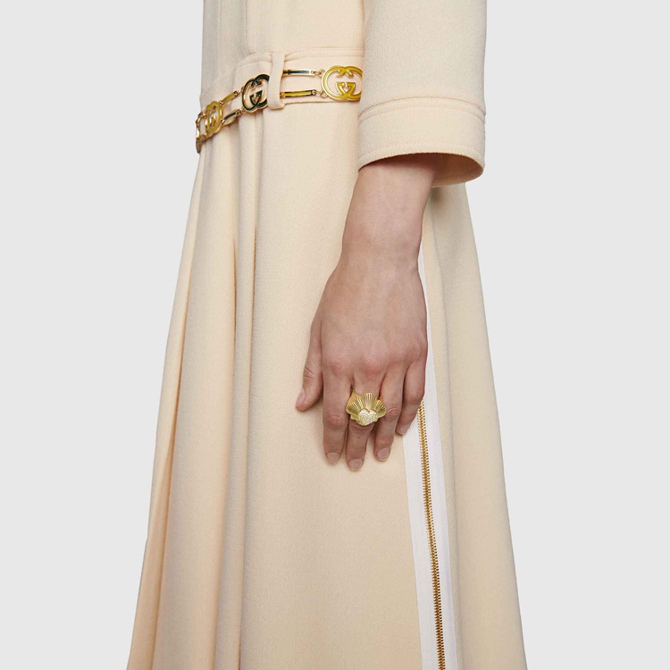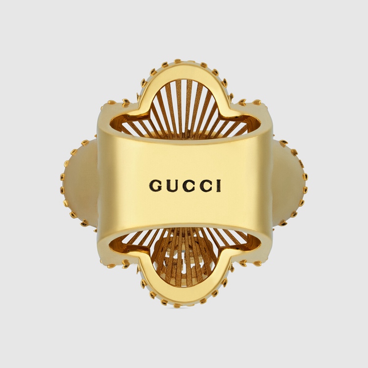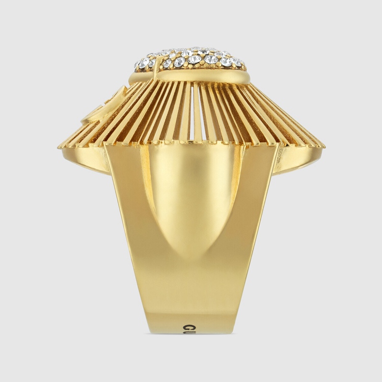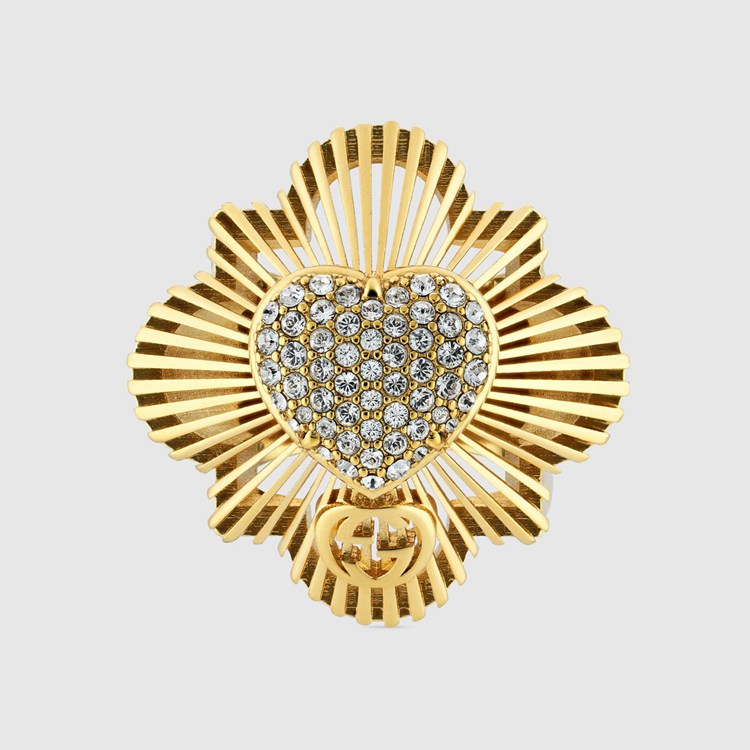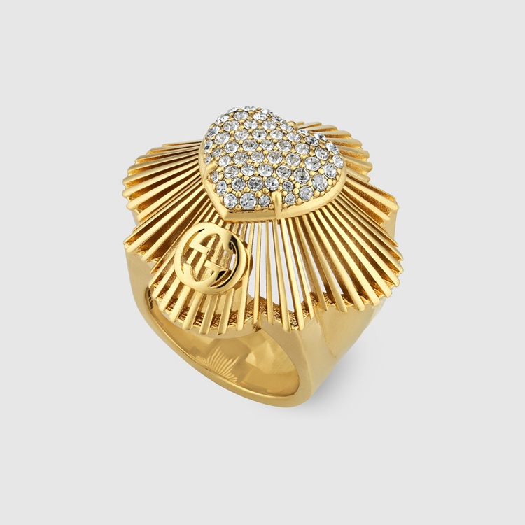 Style 676368 J1D50 8031 Taking a contemporary approach to an antique- Inspired design, This gold-toned metal ring is encrusted With a crystal heart detail. A single Interlocking G motif decorates The vintage style For a subtle logo feel.
