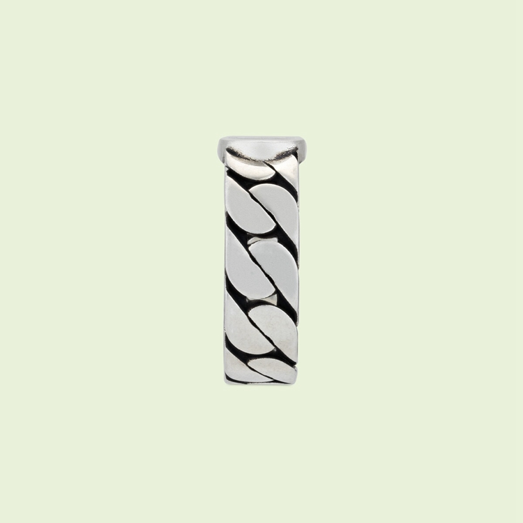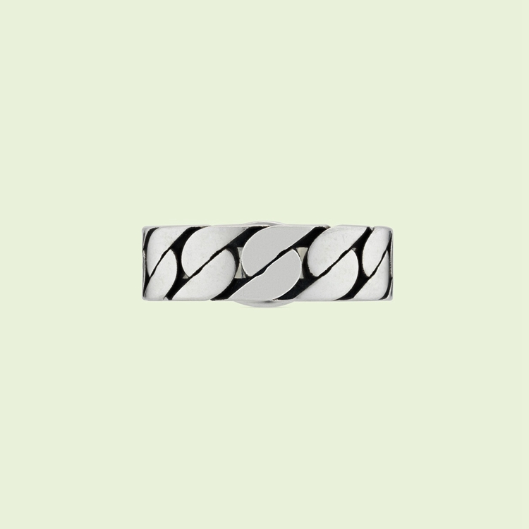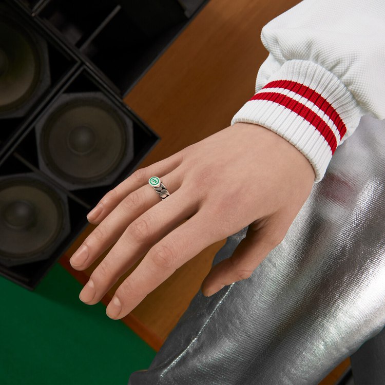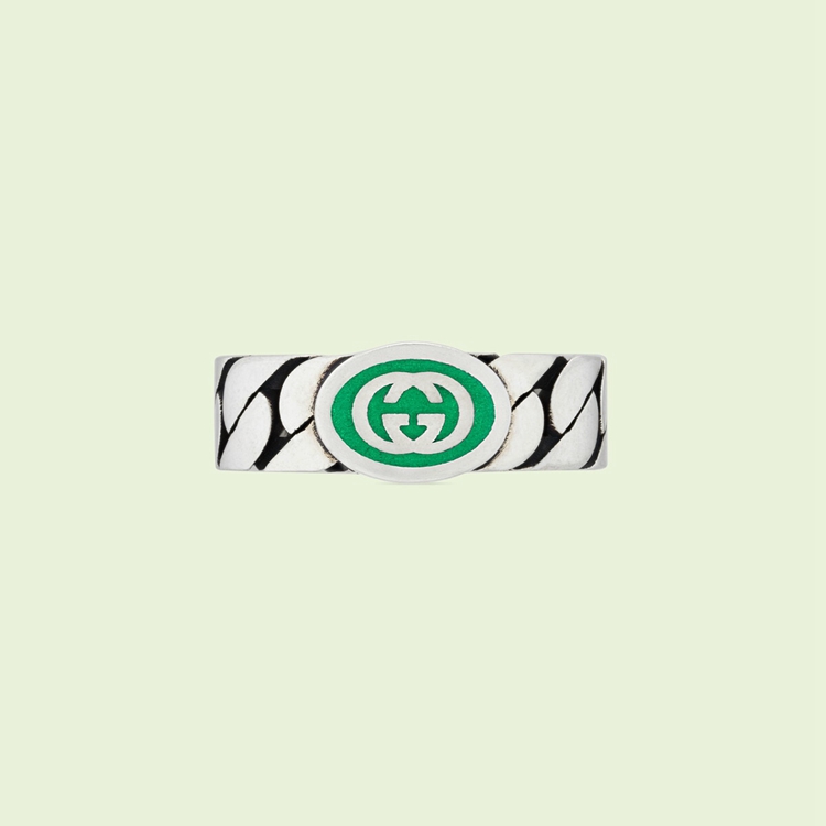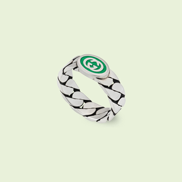 Style 701612 J8410 8414 This ring is Crafted With a wide gourmette construction, reflecting a contemporary aesthetic . The green enameled Interlocking G monogram adds an eye-catching touch to The sterling silver accessory.